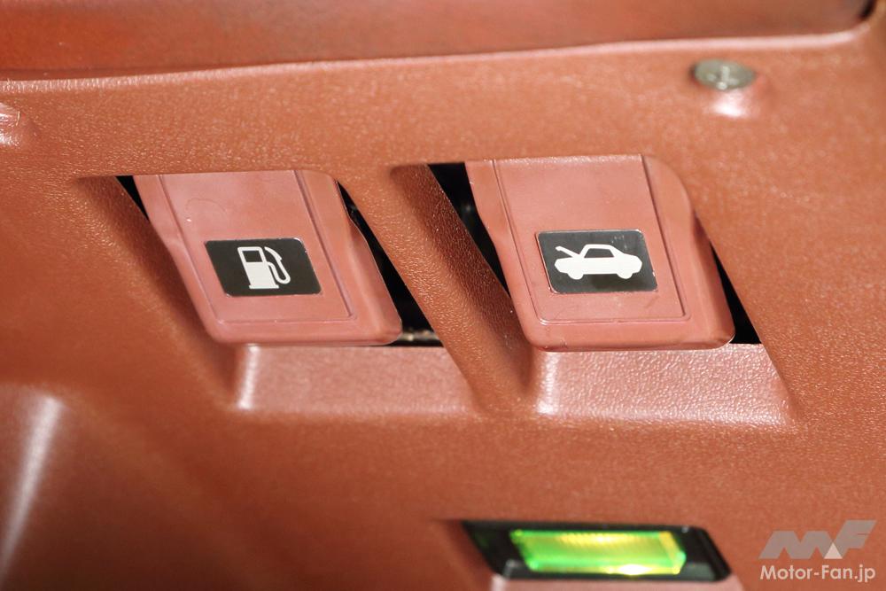 速度警報装置スイッチの下にはフードと燃料給油口リッドのオープナーノブがある。通常なら運転席シート右に配される給油口オープナーノブも含め、インパネアンダーパネルにきちんとデザインされて置いたのがえらい。この時代にしていまのクルマとおんなじじゃないの!