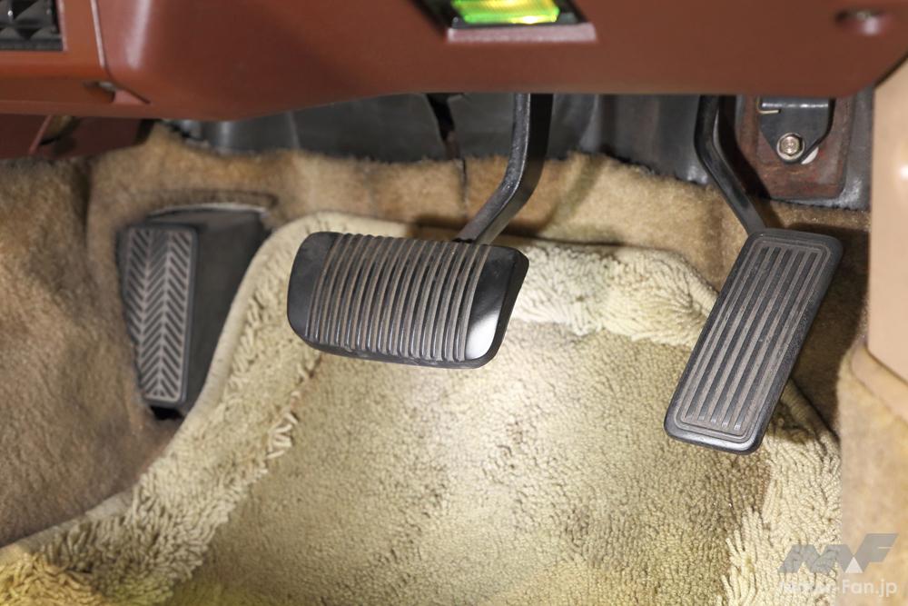 さすがにこの部分はいまのクルマと大差ない。撮影車は4AT車なので、右にアクセルペダル、左にブレーキペダルが並ぶ。
