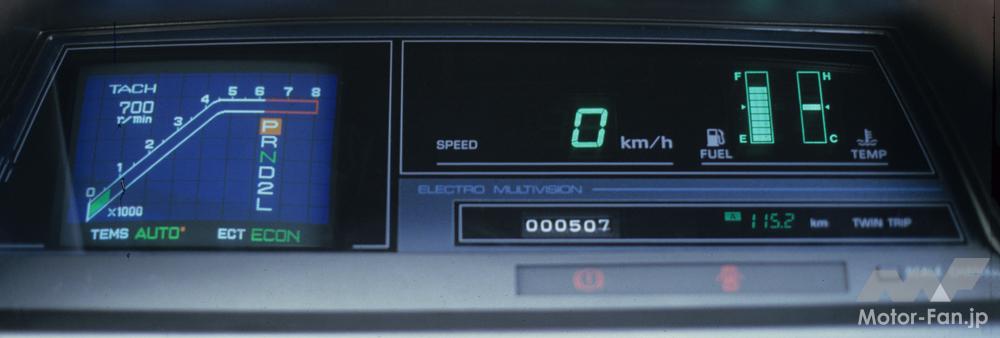 なお、後年1985(昭和60)年のマイナーチェンジでは、ただでさえ未来的だったこのエレクトロニック・ディスプレイメーターがさらに未来的になり、「トヨタ・エレクトロ・マルチビジョン」を内包するエレクトロニック・ディスプレイ・メーターがオプションで用意される。これはこれまでの蛍光管表示エリアを右に詰め、空けた左スペースにCRT(Cathode・Ray・Tube)・・・むかしのテレビと同じブラウン管を当て嵌めた。液晶パネル全盛のいまの目で見ると、こんな狭いところによくもまあ奥行きの要るブラウン管を押し込んだもんだと思う。