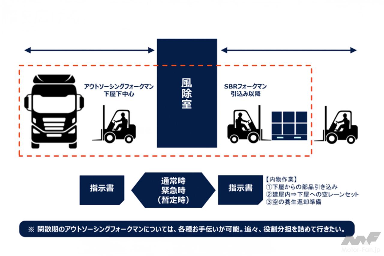 北本工場ではこれを廃止(自動車メーカー初だそう)。トラックドライバーはトラックポートに乗り付けるだけでオーケー。荷役はすべてスバル側で行なうようにした。自主荷役廃止は「トラックドライバーの働き方改革に貢献できる取り組み」とスバルは考えている。
