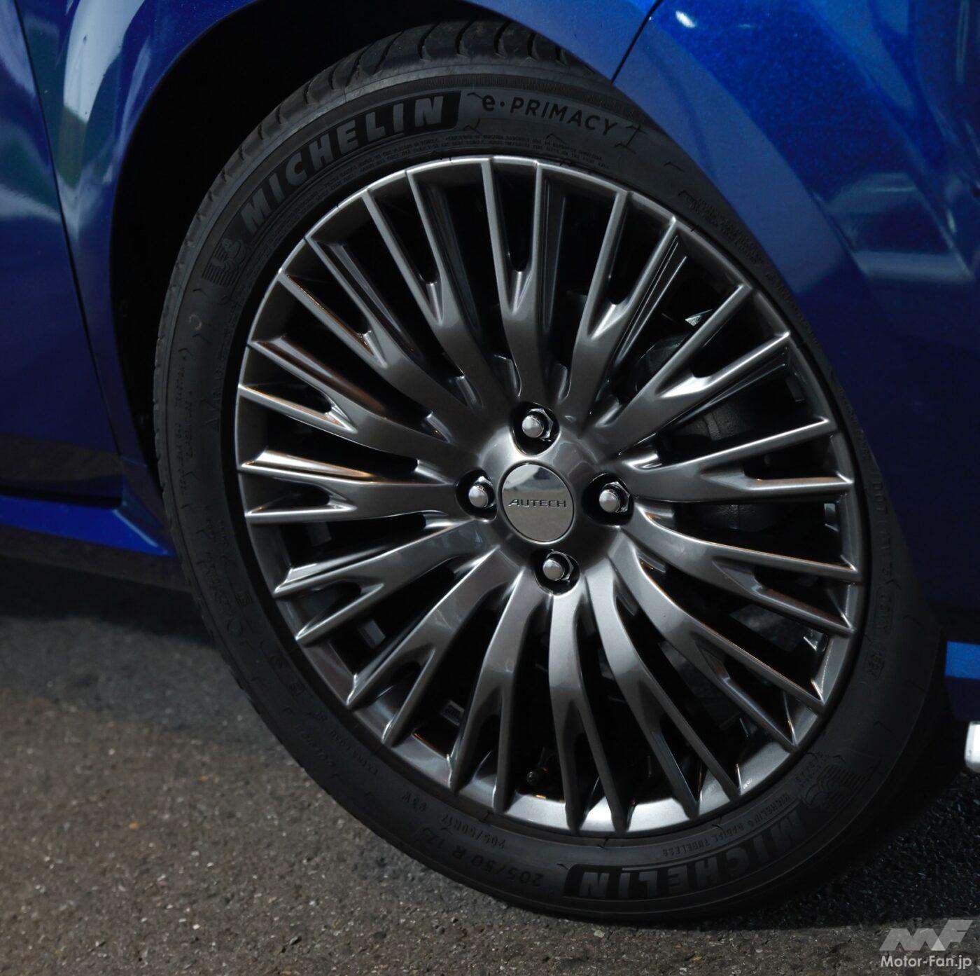 フロントとリアのダンパーには専用のセッティングが施され、コーナリング時のロールを抑えると同時に、荒れた路面でもしなやかな吸収性を発揮する。ミシュラン e·PRIMACYとパフォーマンスダンパー®の組み合わせにより、路面からの入力を適度に抑え、安心感のあるグリップ性能を提供している。これにより、高速道路の直進安定性からワインディングロードでのコーナリング性能まで幅広く対応する走行フィールを実現している。