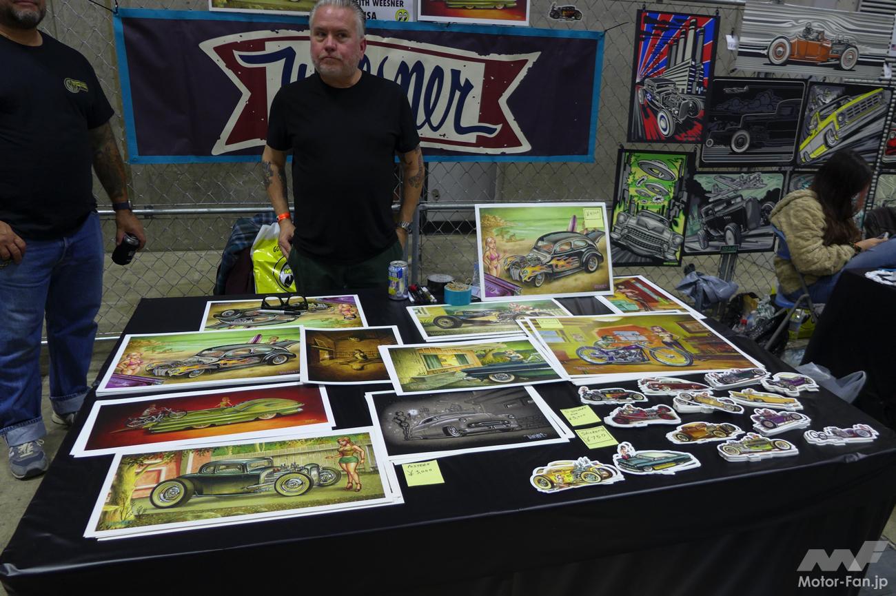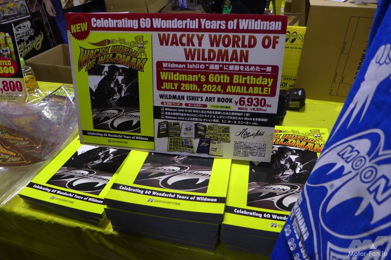 今回は還暦を迎えたMOONEYES PinstriperのWildman石井のスペシャルブースが初登場したこともあり、会場中央から左右に分かれて展開するMOONEYESブースは、HCS会場限定品を含むグッズを求めるファンでいつも以上の賑わいを見せていた。