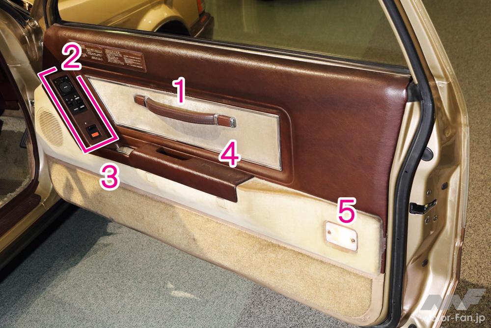 いまのクルマは内張り全体を樹脂成形し、部分部分にパッドなりスイッチなり据え付けている。この頃のクルマは全体がパッド仕立てにした上に必要なものを取り付けている。下3分の1なんてフロアと同じカーペット張り・・・率直に申し上げて、見た目の造りこみ感はこの時代のもののほうが上だ。