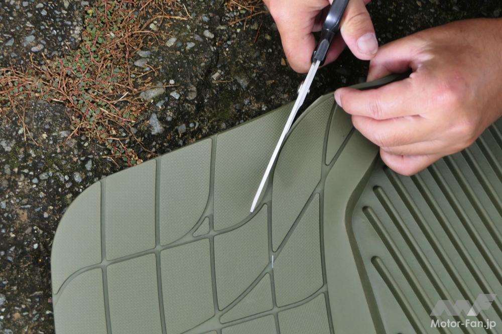 マットの先端部にはカットラインが入っており、ハサミなどで簡単に加工できるのも特徴だ。フロア形状に沿ってカットすれば、まるで車種専用品のようにぴったりフィッティングさせられる。