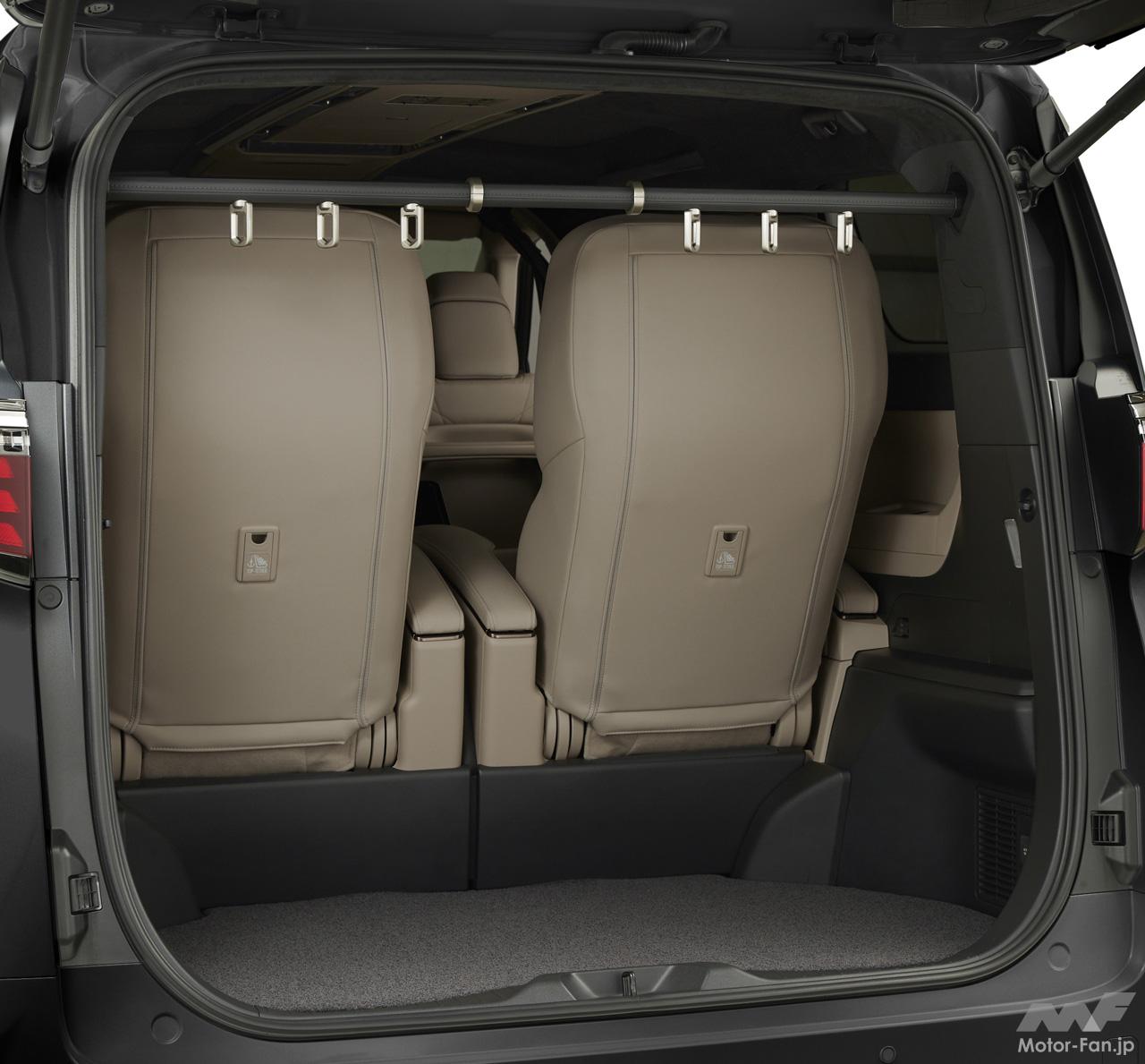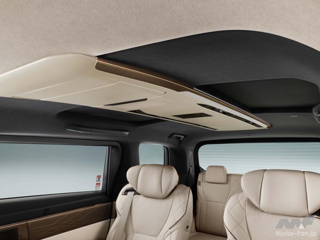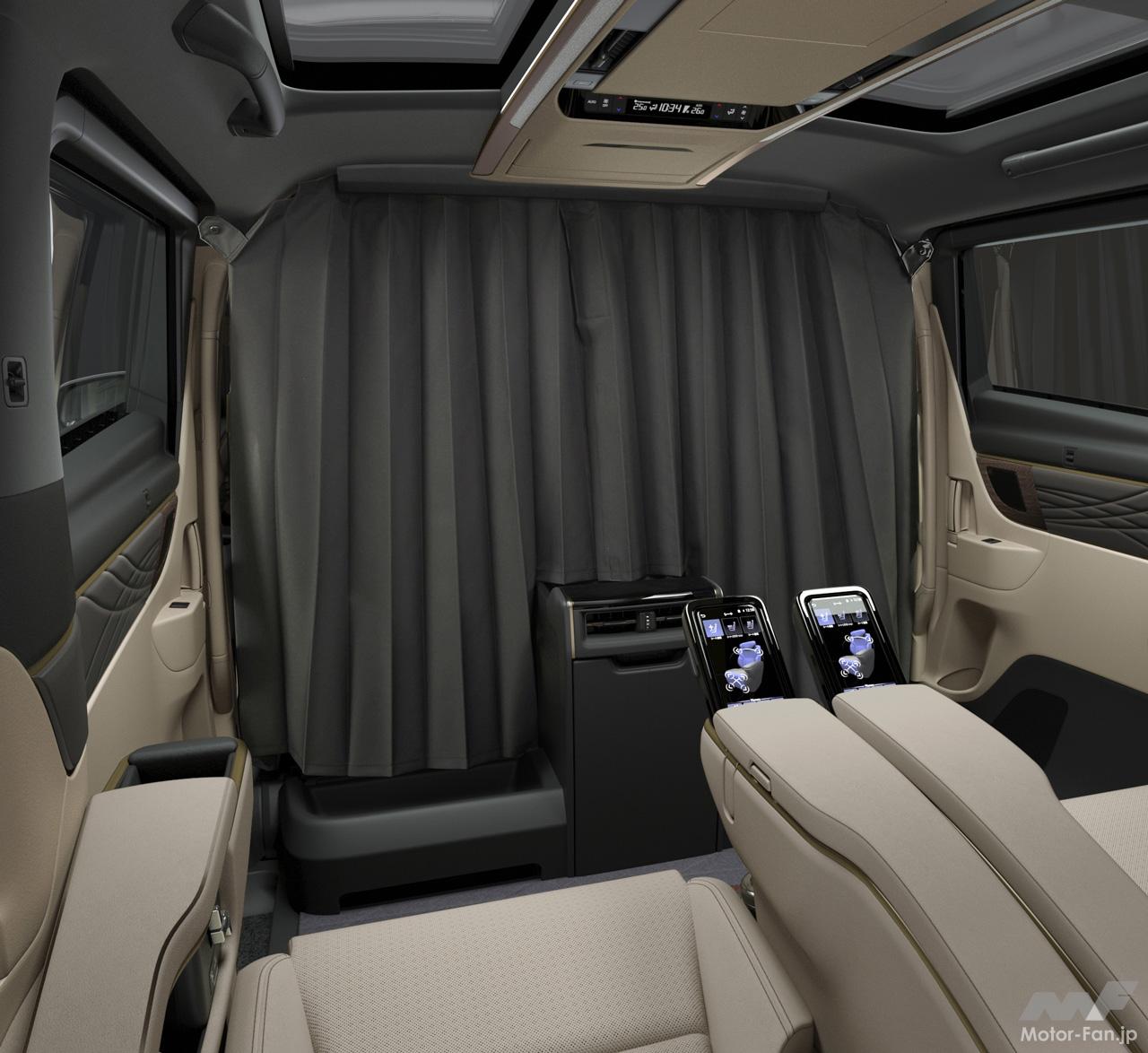 “スペーシャスラウンジ”の後席足元は、ベース車に対して約420mm広いスペースを確保。座り心地が追求されたリヤシートはヘッドレストスピーカーが備わる。また、冷蔵庫やラゲッジルームの洋服掛けも設置されている。