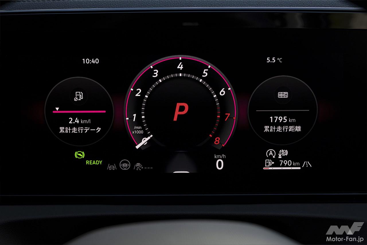ガソリンエンジンは1.5L eTSI mHEVだ。1.5L直列4気筒直噴エンジンに48Vマイルドハイブリッドシステムの組み合わせとなる。ゴルフ8で初めて採用したシステムだが、やはりアップデートを受けており最新世代を搭載。スターターモーターを廃止したのがポイントで、その日一発目も含め常にベルトスタータージェネレーター(BSG)でエンジンの始動を行なう。ゆえにスターターモーターでの始動に比べて静かなのが特徴だ。