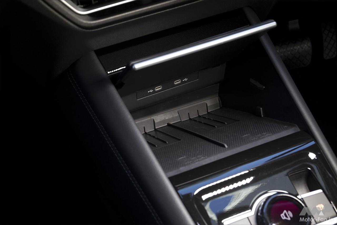 センターコンソールに設置されたドライビングエクスペリエンスコントロールと呼ぶダイヤルは視覚面でも機能面でも新型ティグアンの特徴で、ドライビングプロファイルやオーディオの音量を調節できる。短い試乗時に触れた印象をお伝えしておくと、ありがたみは感じられなかった。ボリューム調整ならステアリングホイール上のボタンを押せば済むし、その他の機能はタッチスクリーンで操作すれば済むからである。助手席の乗員がオーディオの音量を調節するのに役立つだろうか。センターコンソールのダイヤルには感心しなかったが、スマホを2台並べて置いておけるスペースが確保されているのには感心した(しかもワイヤレス充電できる)。