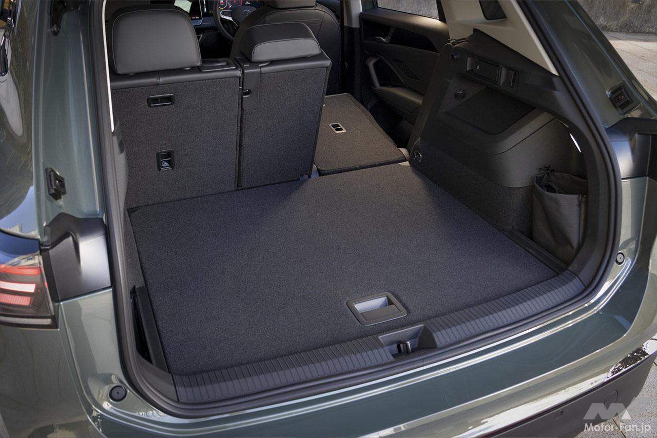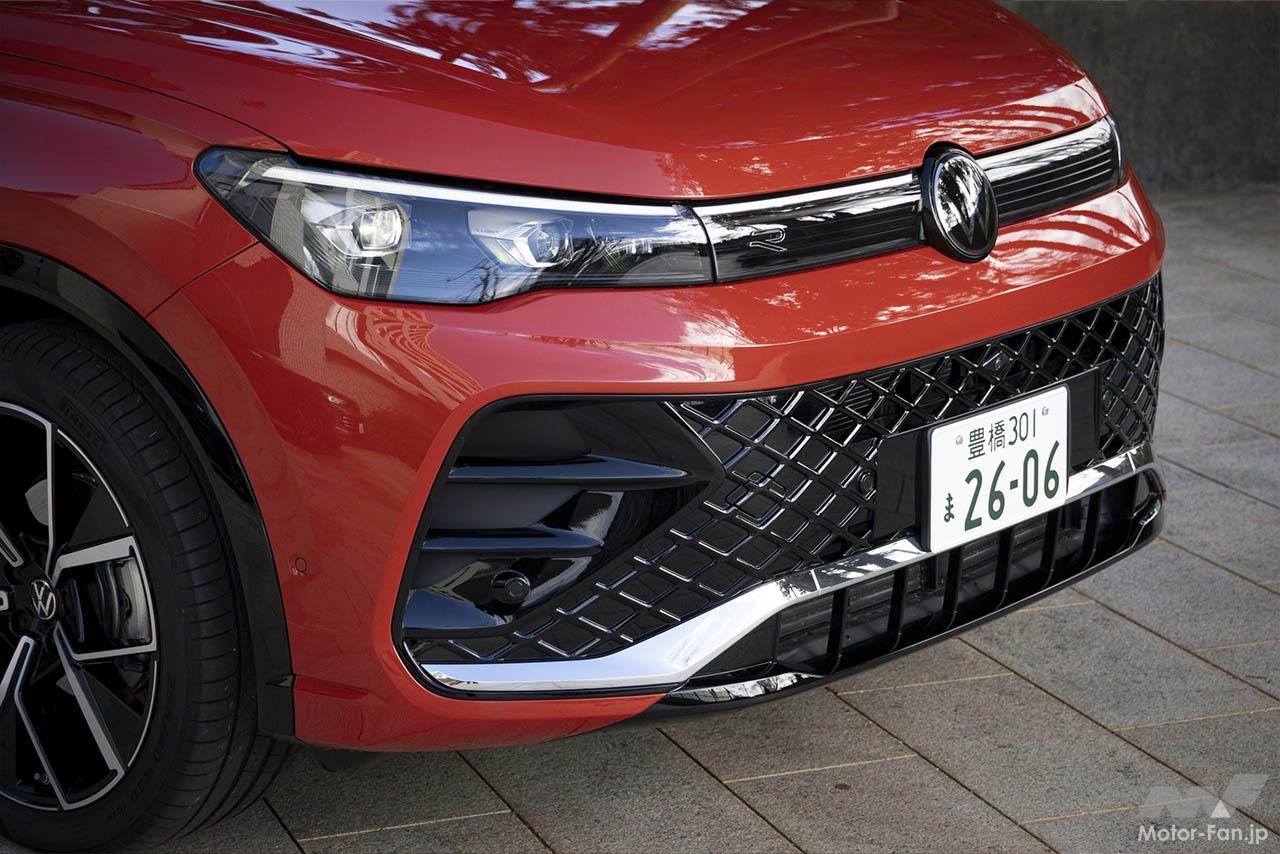 そのティグアンがフルモデルチェンジして3代目に移行した。2代目からの変化点は明白で、ぶ厚いフロントマスクが目を引く。市場のトレンドを取り入れた結果なのだろう。SUVらしい力強さに振った格好だ。リヤはセグメントに分割したライティンググラフィックが先進的な印象を与えるいっぽう、フェンダーの盛り上がりが目立ち、やはり力強さを強調している印象。新型ティグアンが先代に比べて力強さやたくましさを意識しているのは明らかだ。