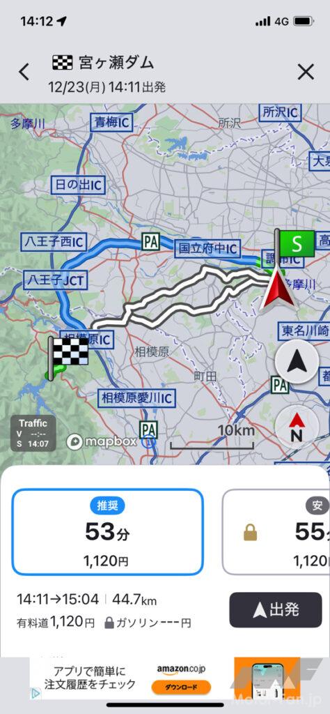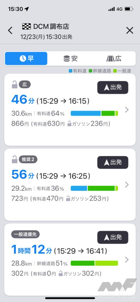 目的地の検索と検索結果からの選択。ルートの提案とその選択については前回でも紹介した通り。「推奨」「一般道優先」が選択できるが「推奨2」や「安い」などは選べない。
