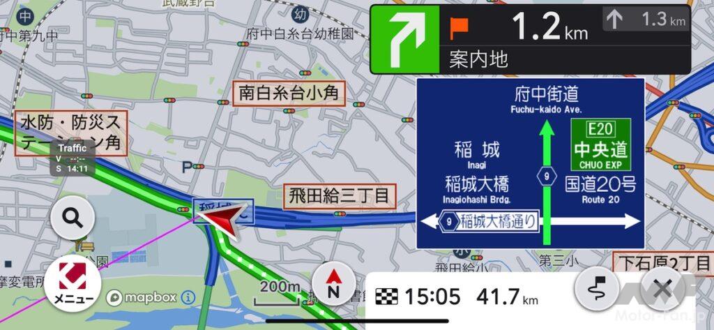 さて、肝心な高速道路上の分岐=ジャンクション(JCT)ではどのような表示になるだろうか?結果から言えば、これも二分割画面でイラストが表示され、進行方向が矢印で示されるというカーナビ同様に表示になっていた。