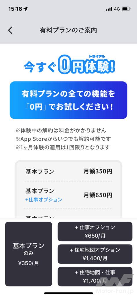 ちなみに有料プランはどのプランでも1ヶ月無料で使用できる。「仕事オプション」や「住宅地図オプション」も含めて、お試しで使ってみるのも面白いが、これらは月額料金も大きいので後々変更を忘れるとお財布が痛い目を見ることになるので注意が必要だ。