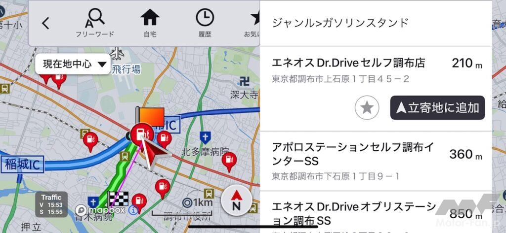「駐車場を探す」については前回紹介しているので、「ガソスタを探す」を使用して中継地に設定してみた。カーナビの施設検索では当たり前だし、『COCCHi』の検索画面からもジャンルとして選択できるが、メニューからクイックアクセスで自車周囲のガソリンスタンドを表示してくれるのはありがたい。