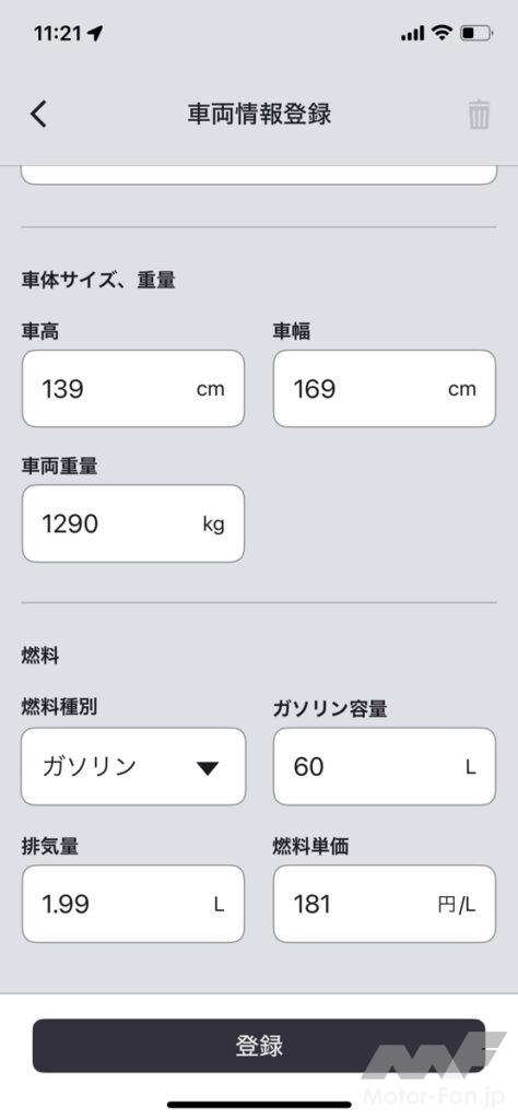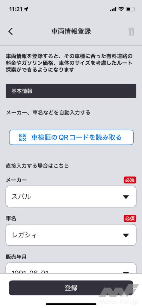 クルマを登録しておけばクルマに合わせたルート設定ができたり履歴も残せる