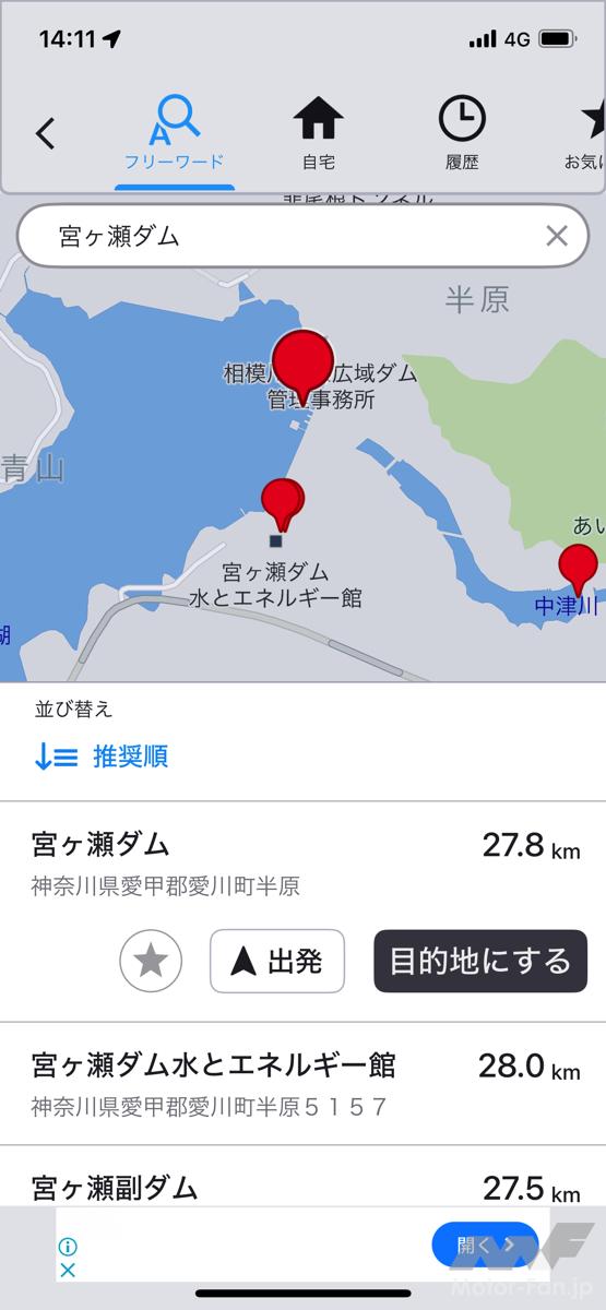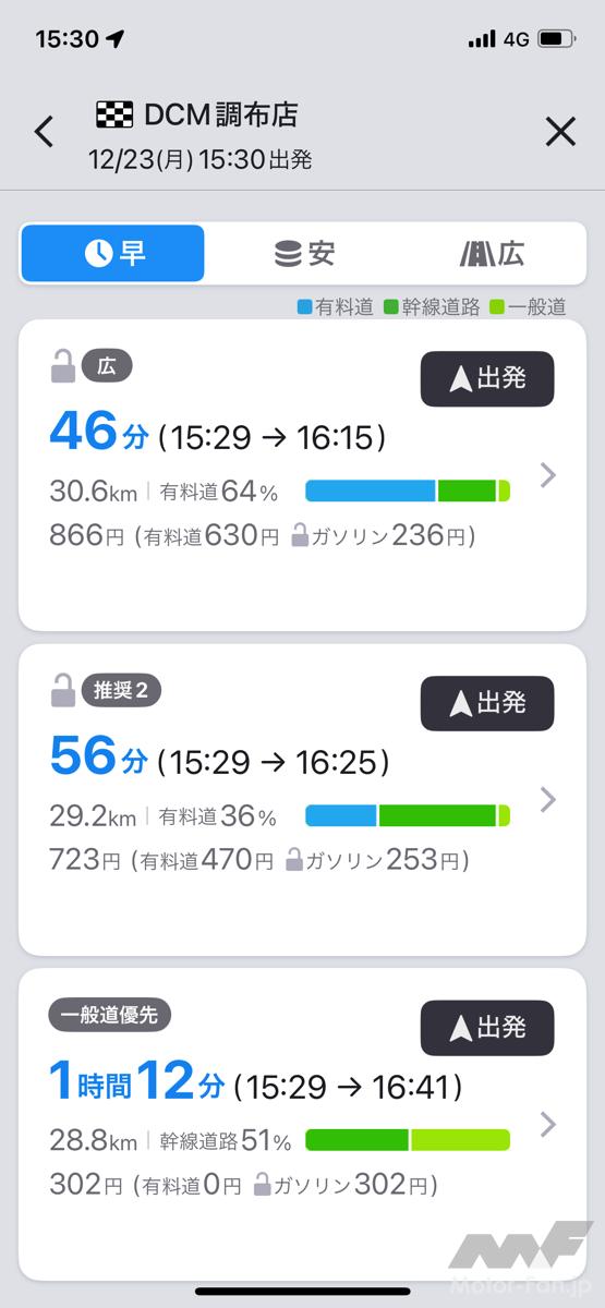 目的地の検索と検索結果からの選択。ルートの提案とその選択については前回でも紹介した通り。「推奨」「一般道優先」が選択できるが「推奨2」や「安い」などは選べない。