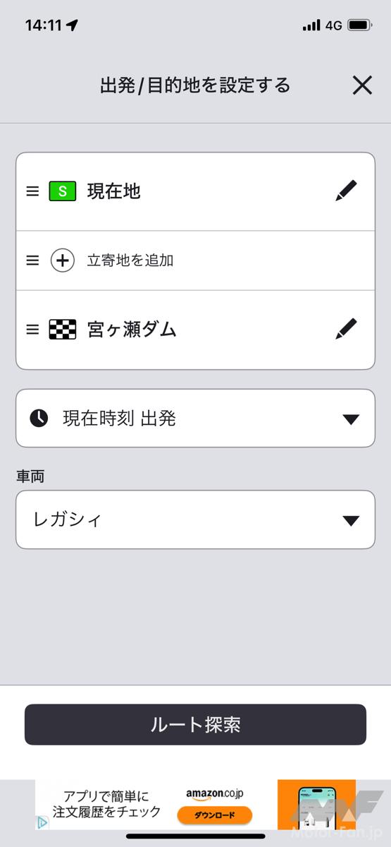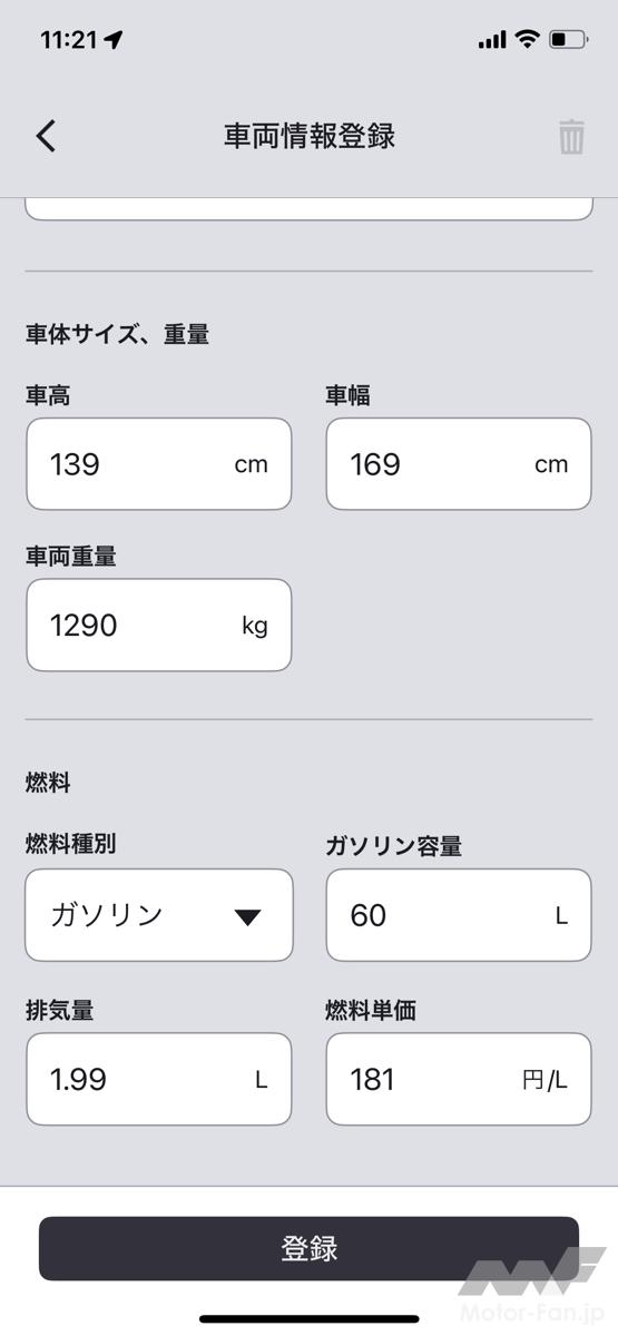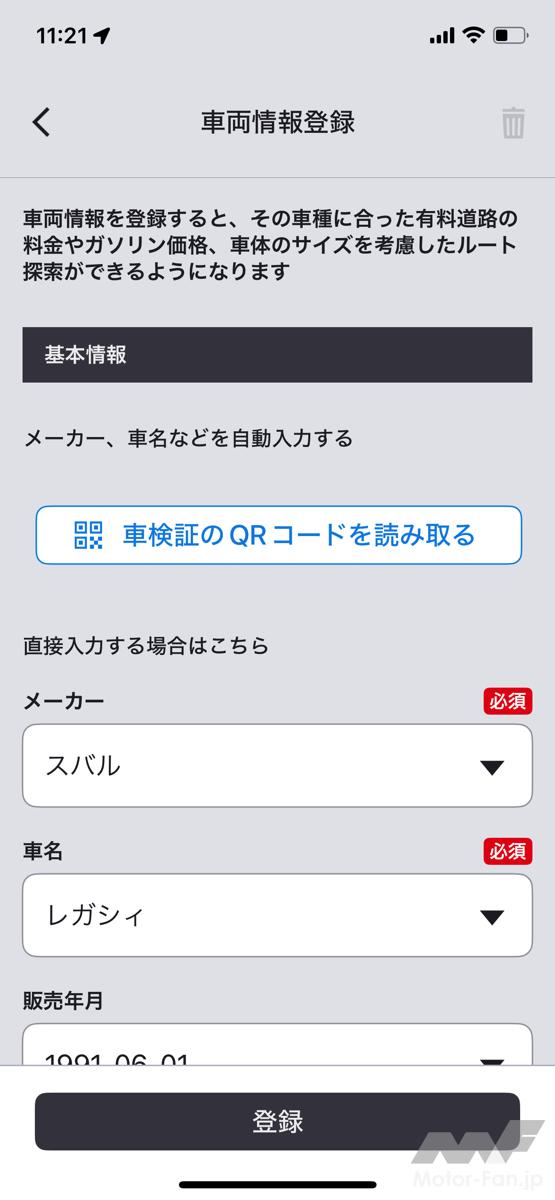 クルマを登録しておけばクルマに合わせたルート設定ができたり履歴も残せる