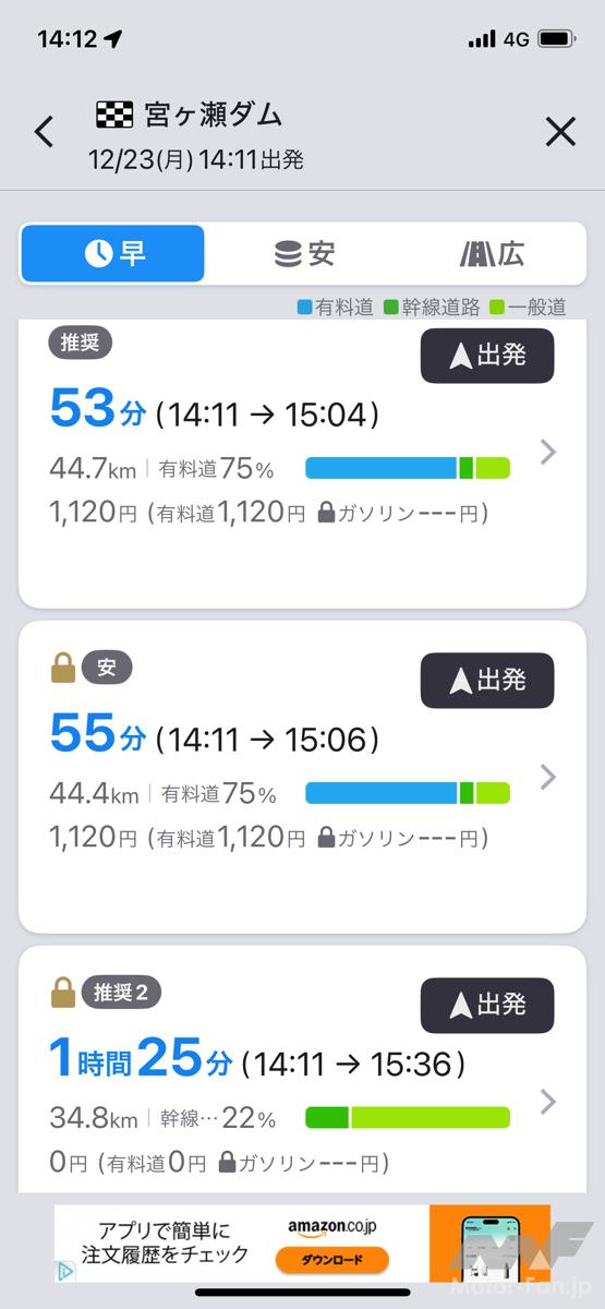 やはり無料版との大きな違いは「推奨」と「一般道優先」以外のルートが選べるようになることだ。