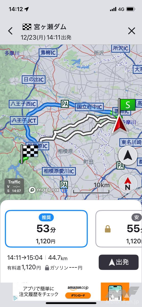 「推奨ルート」を選択してスタートしたが、ナビ画面では広告もなく画面がディスプレイオーディオに比べて小さく、先々の車線案内が表示されない以外は使用感に違いは無さそうだ。