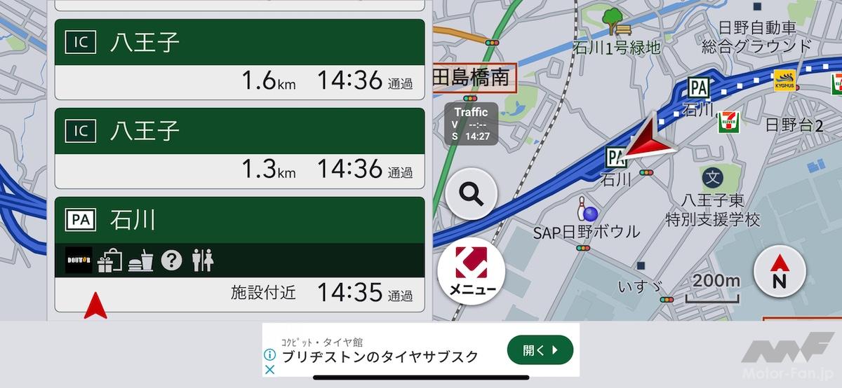 高速道路に乗ると、降りるインターチェンジ(IC)、途中のインターやサービスエリア/パーキングエリア(SA/PA)が二分割画面で表示されるのも一般的なカーナビと同様。さらに残った地図画面にも料金所などが表示されることがあるが、その際は残った地図エリアがかなり狭くなるのは仕方ないところか。その状況で地図を見ないといけないということもないので問題は無いだろう。
