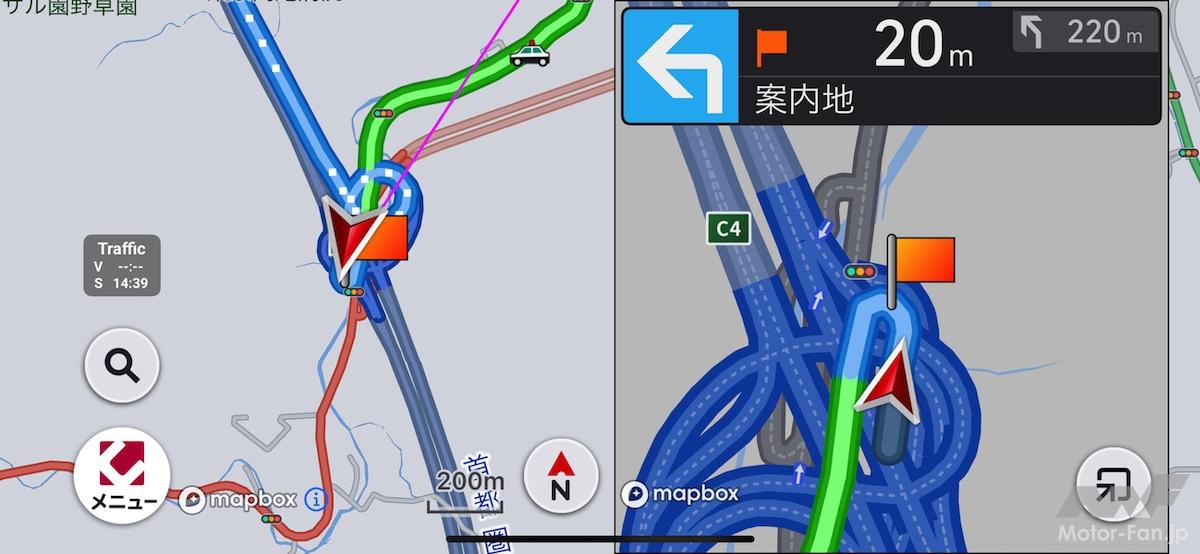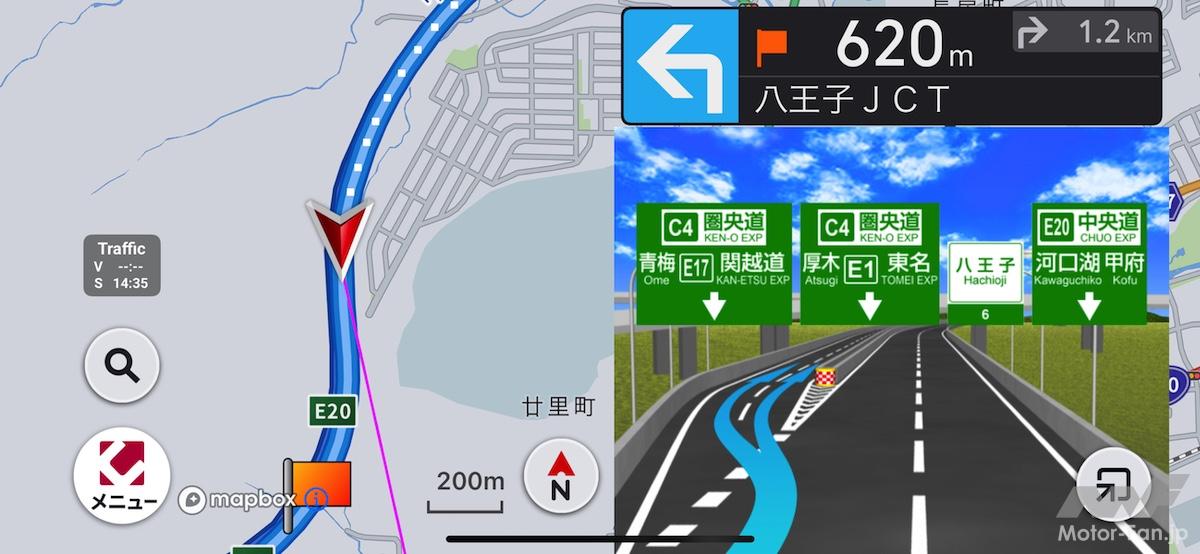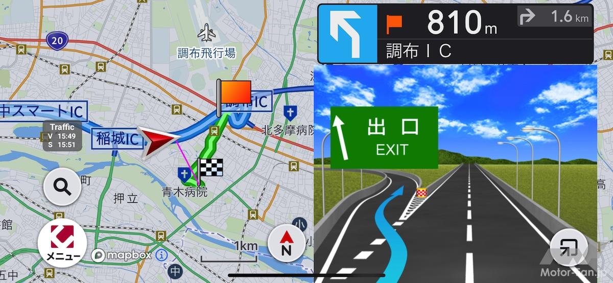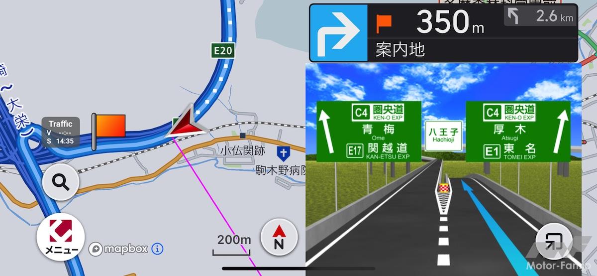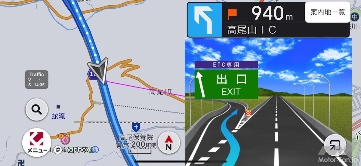 さて、肝心な高速道路上の分岐=ジャンクション(JCT)ではどのような表示になるだろうか?結果から言えば、これも二分割画面でイラストが表示され、進行方向が矢印で示されるというカーナビ同様に表示になっていた。