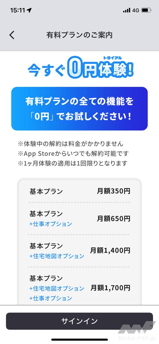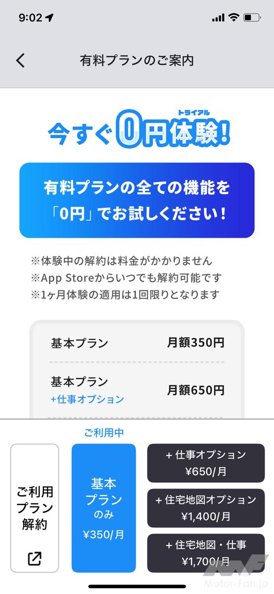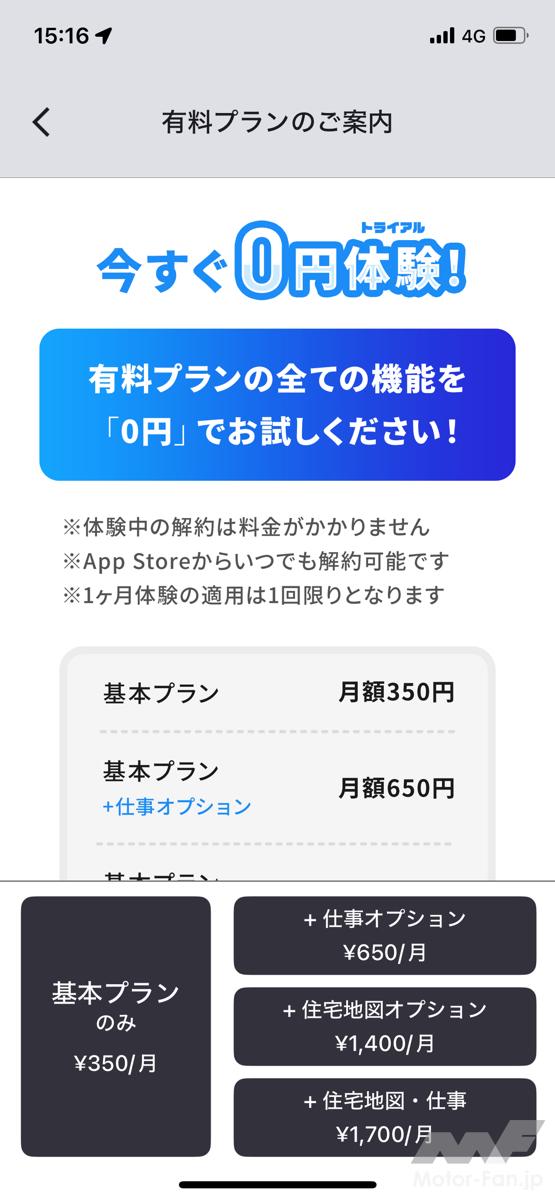 ちなみに有料プランはどのプランでも1ヶ月無料で使用できる。「仕事オプション」や「住宅地図オプション」も含めて、お試しで使ってみるのも面白いが、これらは月額料金も大きいので後々変更を忘れるとお財布が痛い目を見ることになるので注意が必要だ。