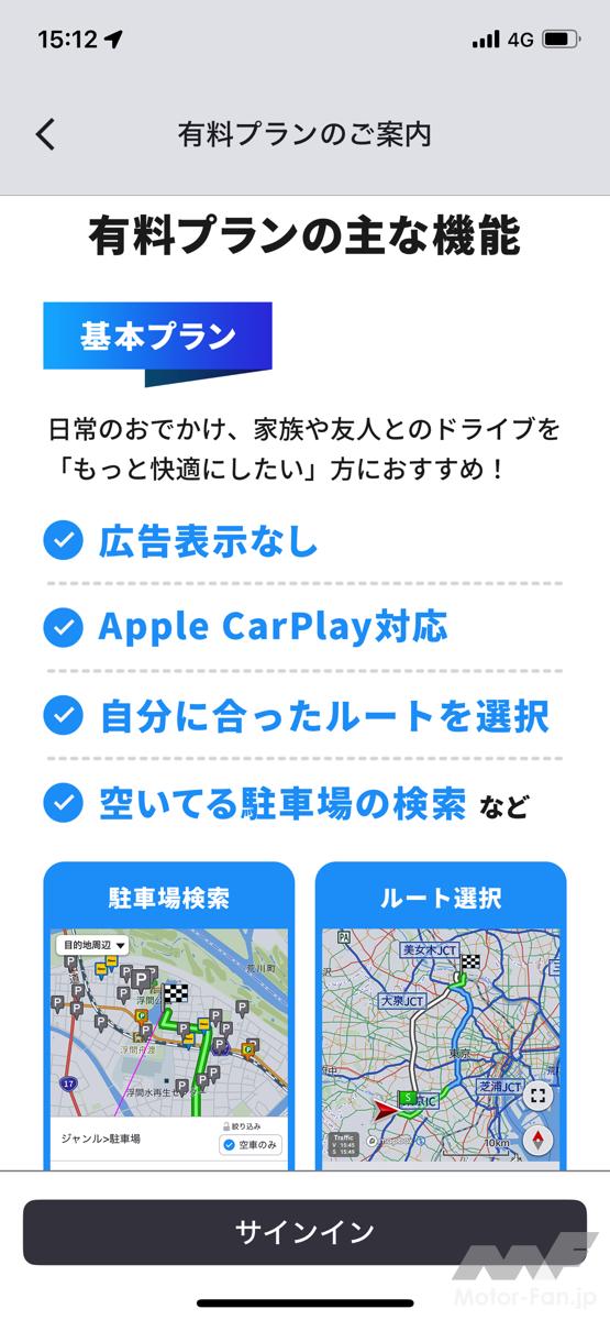 前回も紹介している豊富なルートバリエーションと空き駐車場検索と合わせて、基本プランの機能の充実ぶりが際立った。加えて、ユーザーの声を反映した機能改善や強化が適宜アップデートされ、手間も費用もなく使用可能になっていくことを考えると、これで350円/月はむしろ安いのではないかという思いは前回以上に感じられた。