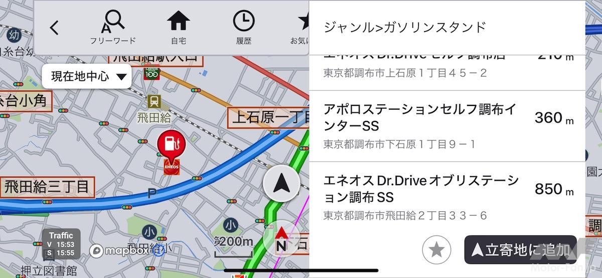 「駐車場を探す」については前回紹介しているので、「ガソスタを探す」を使用して中継地に設定してみた。カーナビの施設検索では当たり前だし、『COCCHi』の検索画面からもジャンルとして選択できるが、メニューからクイックアクセスで自車周囲のガソリンスタンドを表示してくれるのはありがたい。