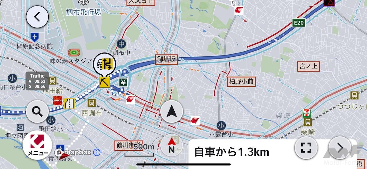 「並走道路」に切り替えは現在のルート並走するルートに簡単にルート変更ができるほか、「渋滞情報」表示にもクイックアクセスできるようになっている。渋滞情報は渋滞状況だけでなく、工事などの各種規制もアイコンで表示される。