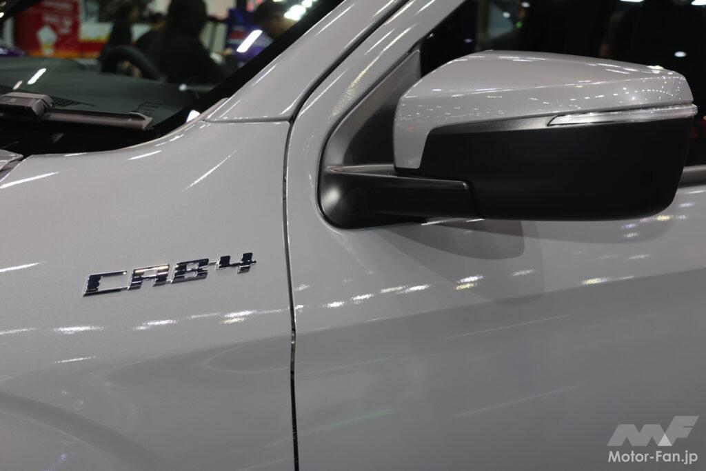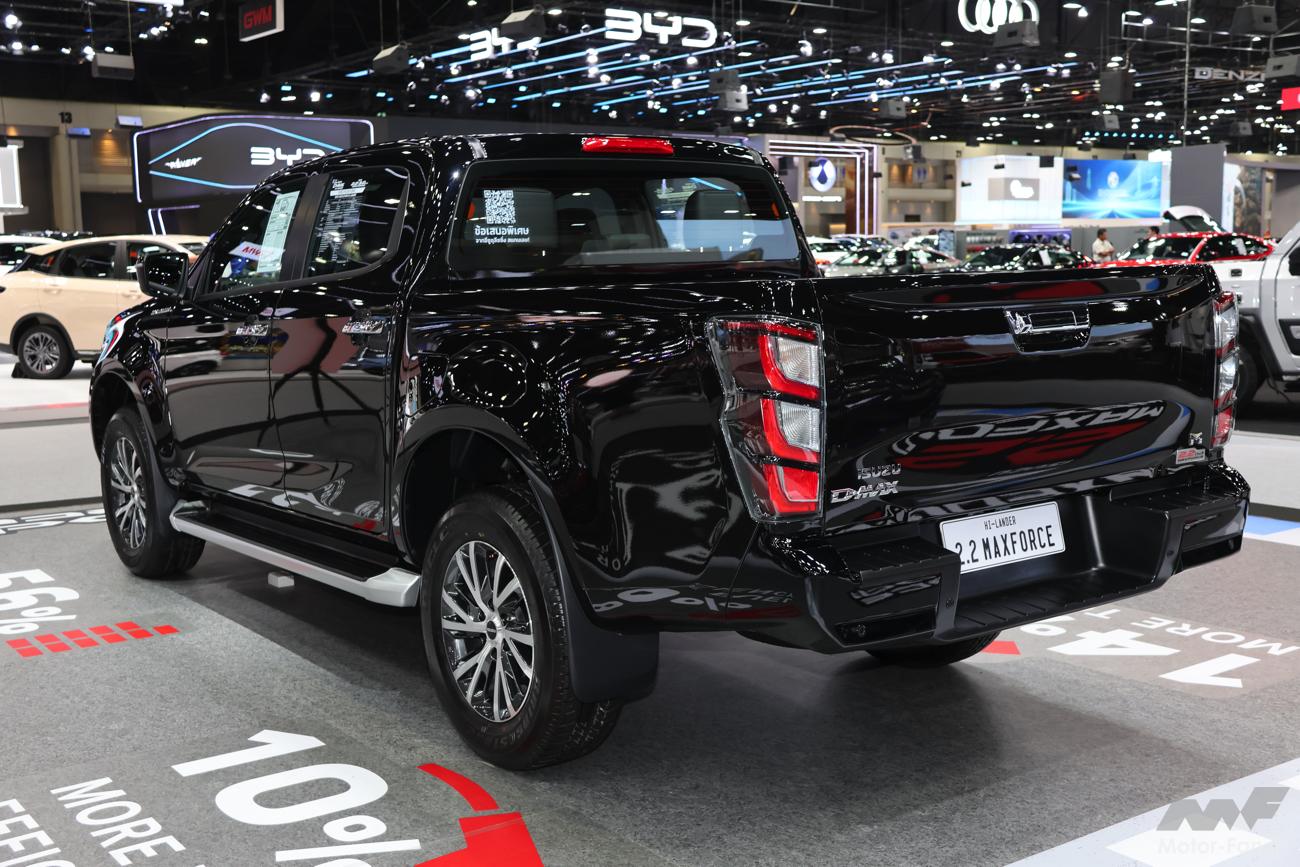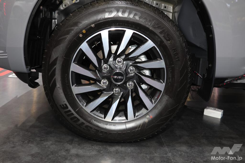 モーターエキスポの会場のD-MAXは、ダブルキャブを中心に展示。新エンジン展示車では「CAB4」と「HI-LANDER」を展示。2タイプ共にFRとなるが、最大の違いは最低地上高にある。CAB4の16インチホイール装着車が200mmなのに対して、HI-LANDERの18インチホイール装着車では240mmを確保。240mmという数値は4WD仕様と同等のため、未舗装路など道の悪いところも走りやすい。またヒップポイントも上がるため、乗降しやすいようにサイドステップも付属する。