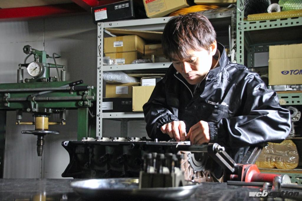 中心間距離は純正から3mm短くなっているのだが「ポイントはピストン設計ですね。ウチのピストンはアルミの熱膨張を正確に把握した上で設計しています。熱が入った時に真円になるよう、楕円、タル型なんですね。これによってピストンの首フリを抑えているんですよ」と、東名パワード冨田さん。