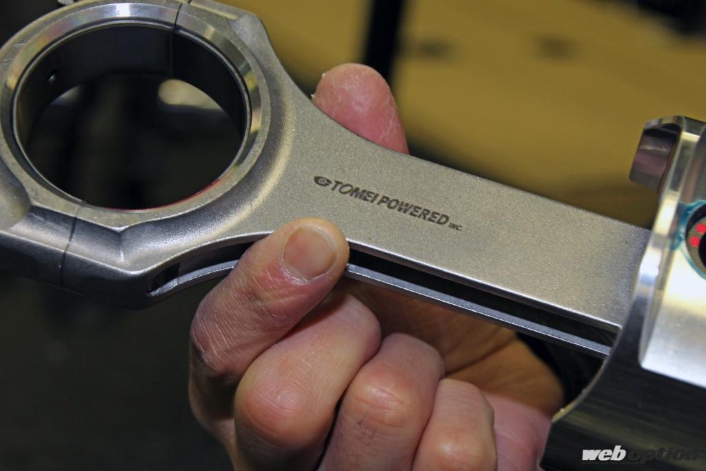 コンロッドの形状にはH断面とI断面があり、エンジンのスペックや用途に応じて使い分けられるが、東名パワードはH断面を選択。コストよりも強度と軽量性を重視したというわけだ。重量はノーマル770gに対して665gと、大幅な軽量化も達成している。素材はニッケルクロムモリブデン鋼だ。コンロッドボルトはARP社の高強度タイプとなる。