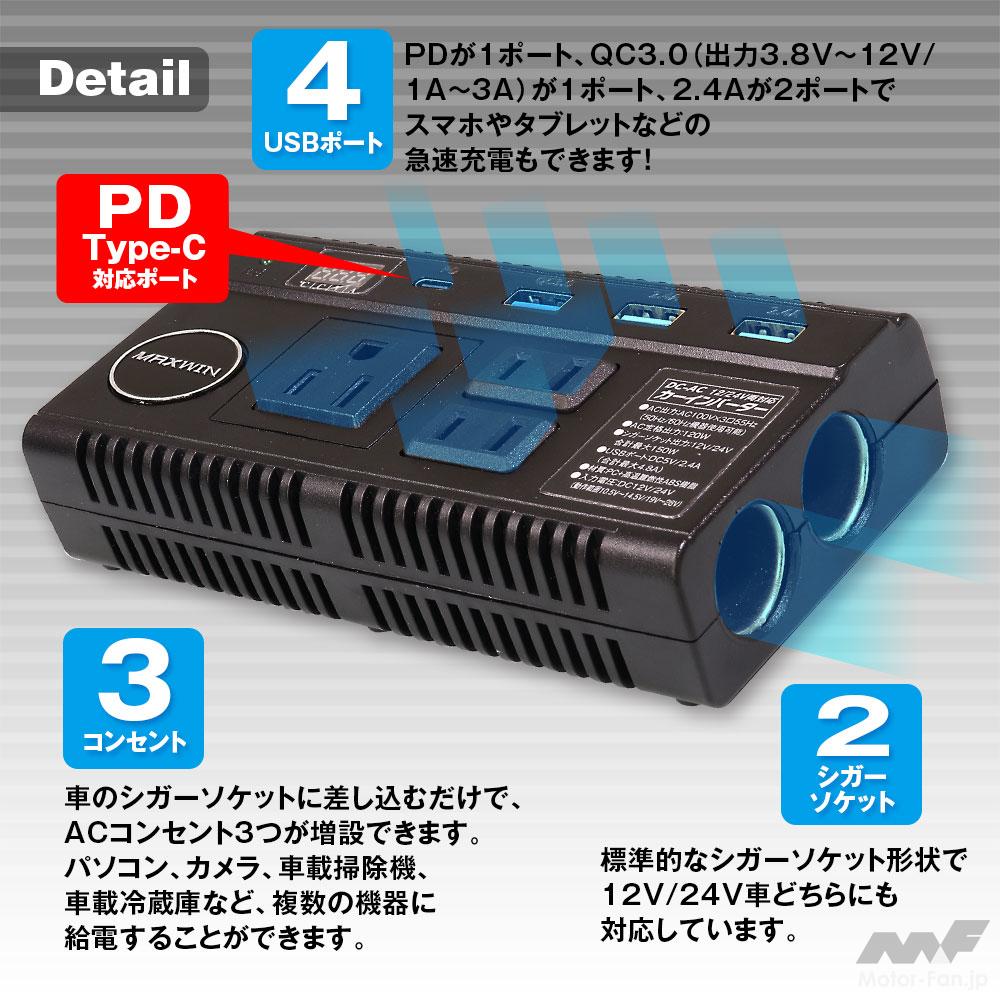 シガーソケットは12V、24Vのどちらにも対応し、最大出力は150W。そして100Vコンセントは家庭用の機器を利用でき、定格出力120Wまでに対応する。USBポートはPD×1、QC3.0×1、2.4A×2と3種類の規格を用意し、スマホやタブレットなどモバイル機器の急速充電もOKだ。