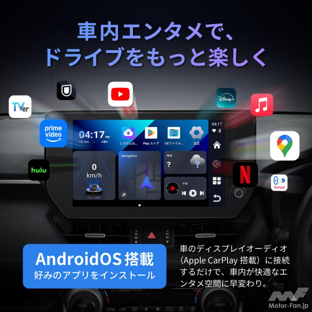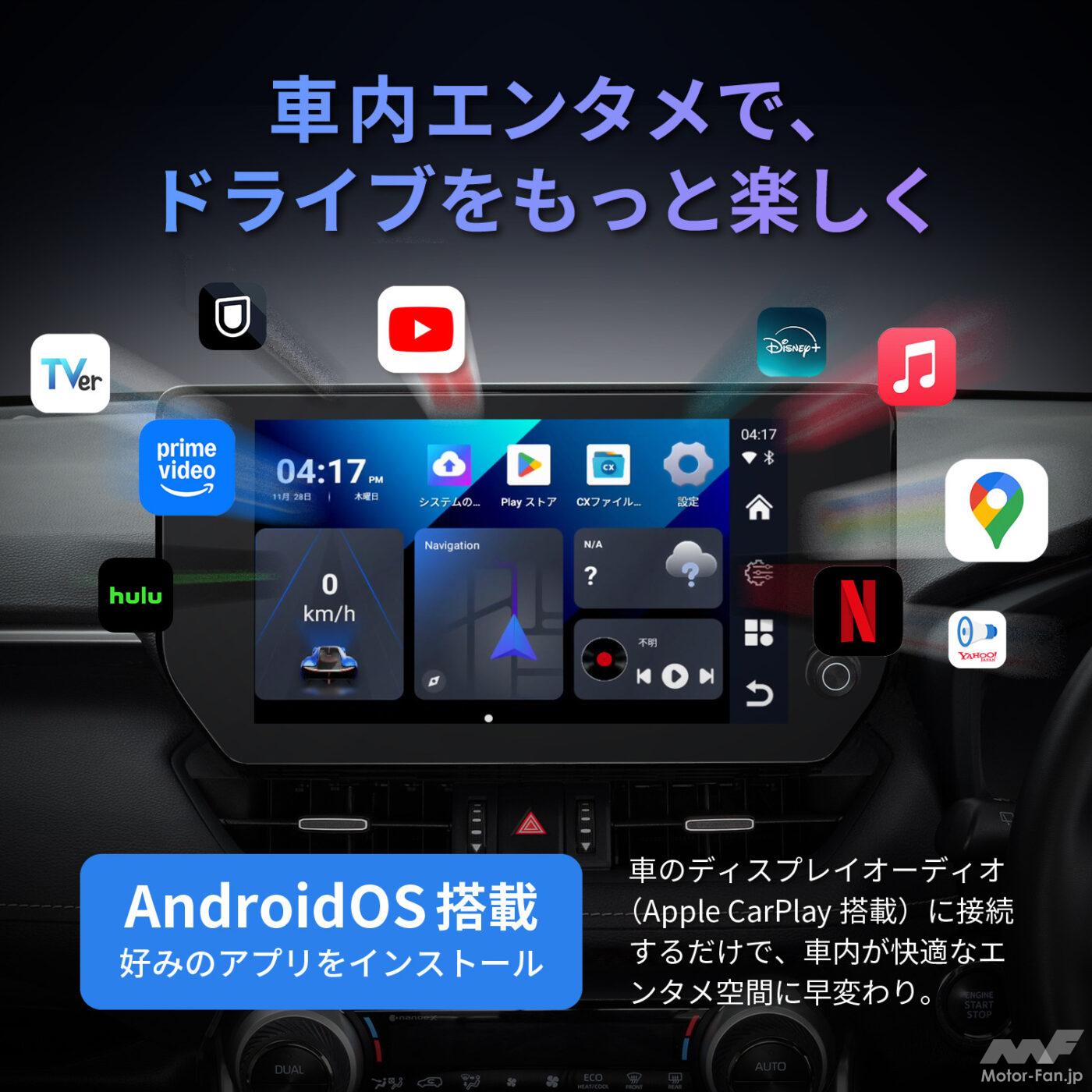 PIXYDA 『RAY17-PCS47』は、Apple CarPlay対応ディスプレイオーディオと接続することで、エンタメ性を拡張できるAI BOX。本体にはWi-FiやGPS、64GBストレージ、マイクロSDカードスロット、Qualcomm Snapdragon 665プロセッサー、Android OSなどを搭載し、YouTubeやNetflix、Hulu、Amazon Prime Videoなどの動画配信サービスの再生を実現する。
