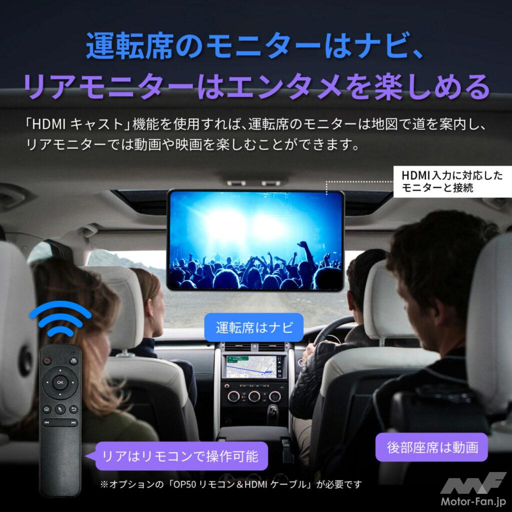 ほかにも音声検索(Googleアシスタント)でリアルタイム情報を探したり、Apple CarPlay / Android Autoをワイヤレスで接続することもできる。『OP50リモコン&HDMIケーブル(オプション)』を組み合わせて使えば、後席モニターにエンタメ映像を映し出したり、自宅のテレビに映像を映し出すなどのシステム拡張にも対応する。