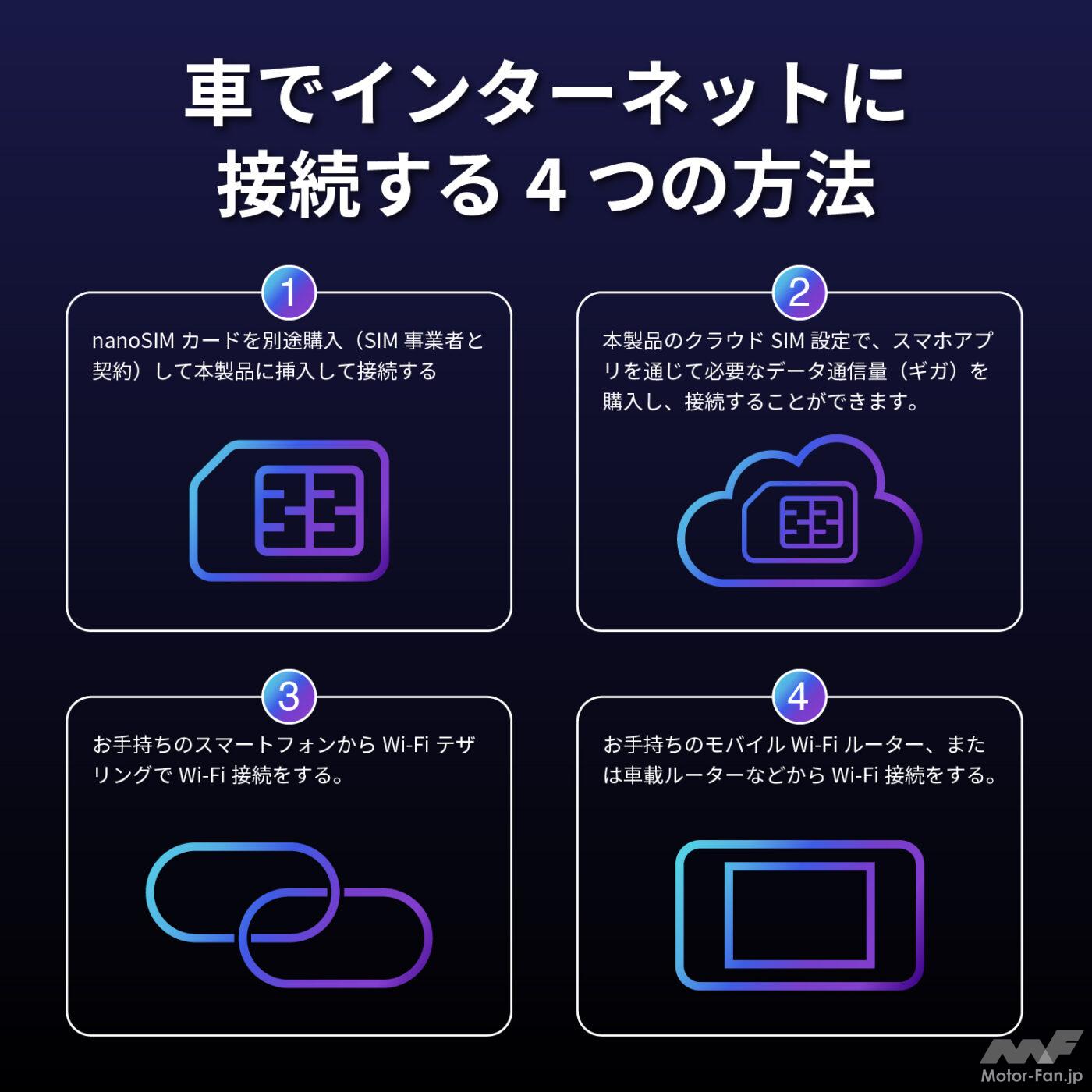 なお通信手段は、nanoSIMを購入して挿入、クラウドSIM設定で通信量を購入、手持ちのスマホをテザリング接続、手持ちのモバイルルーターを利用、の4つの方法が選べる。