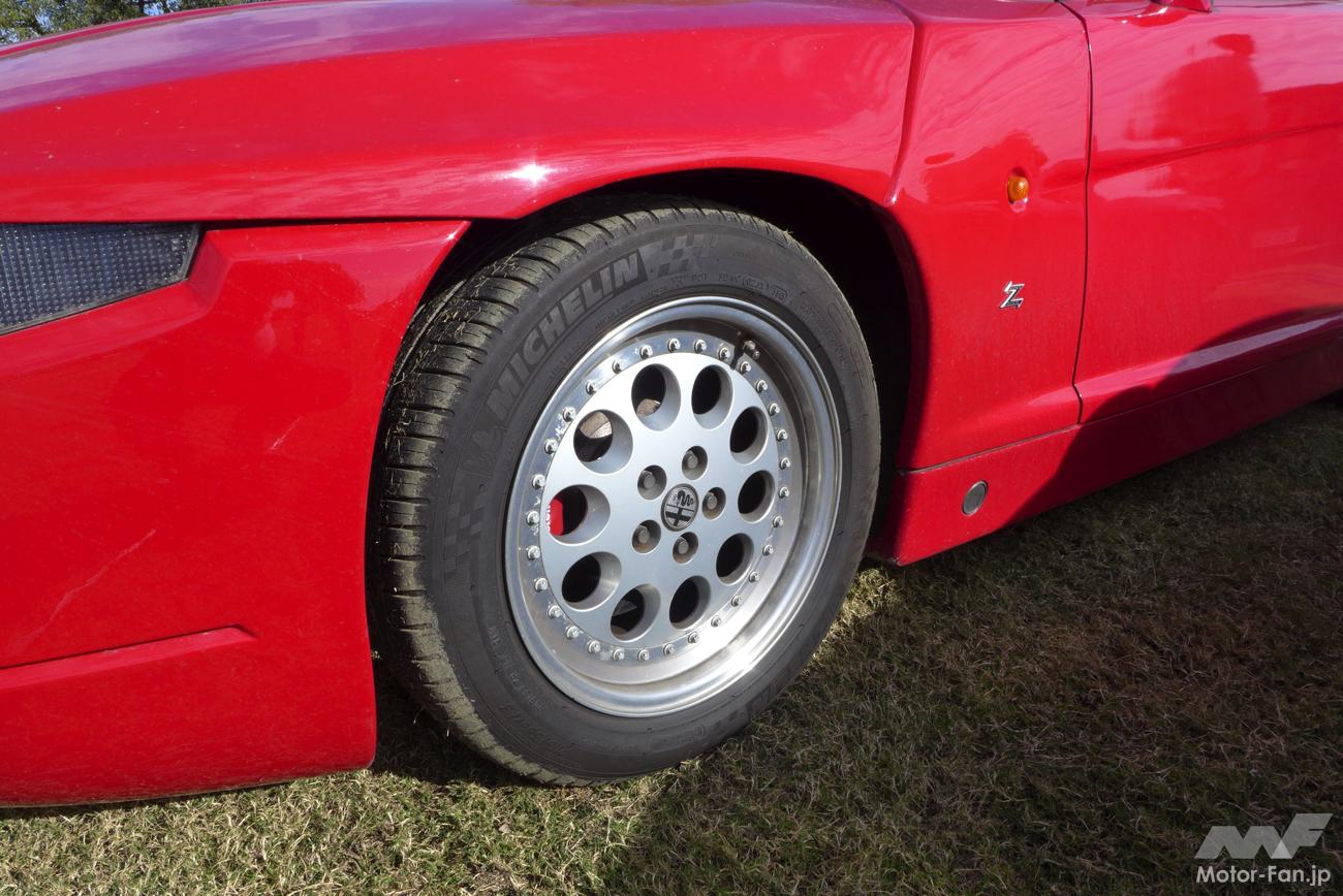 サスペンションはアルファロメオ75グループA/IMSAのものが流用されている。これをベースにランチアとフィアットのラリーワークスチームのエンジニア兼チームマネージャーであったジョルジオ・ピアンタがSZ用にセッティングを施したのだ。段差を乗り越えるために車内からボタン操作で車高調整が可能な油圧ダンパーシステムはコニ製を採用。ライン装着用のタイヤには、フロント:205/55ZR16、リヤ:225/50ZR16サイズのピレリPゼロが選ばれていた。