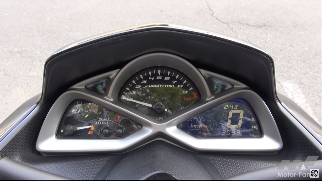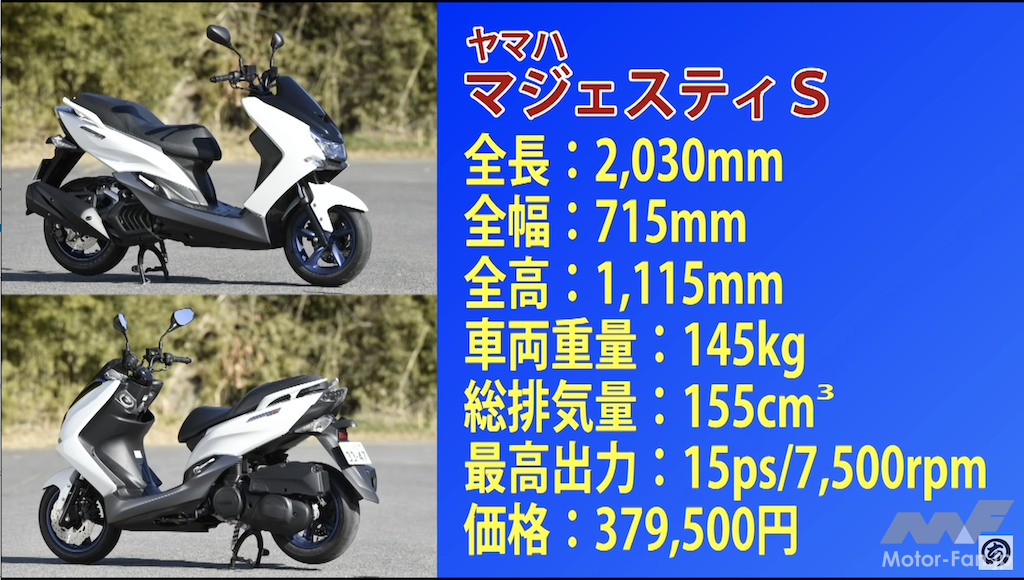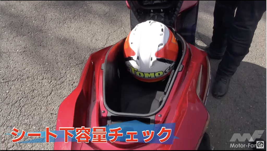 動画では一番初めに紹介されているマジェスティS。スペックだけでなくタコメーターを装備するアナログメーターの様子や足つき、シート下容量などをチェックしている。足つき性は身長170センチの編集部サンタサンが担当して不安のなさを確認。シート下にはフルフェイスのヘルメットを実際に収納して確認している。そのほかポケットの容量や給油口の使い勝手などもチェックしている。