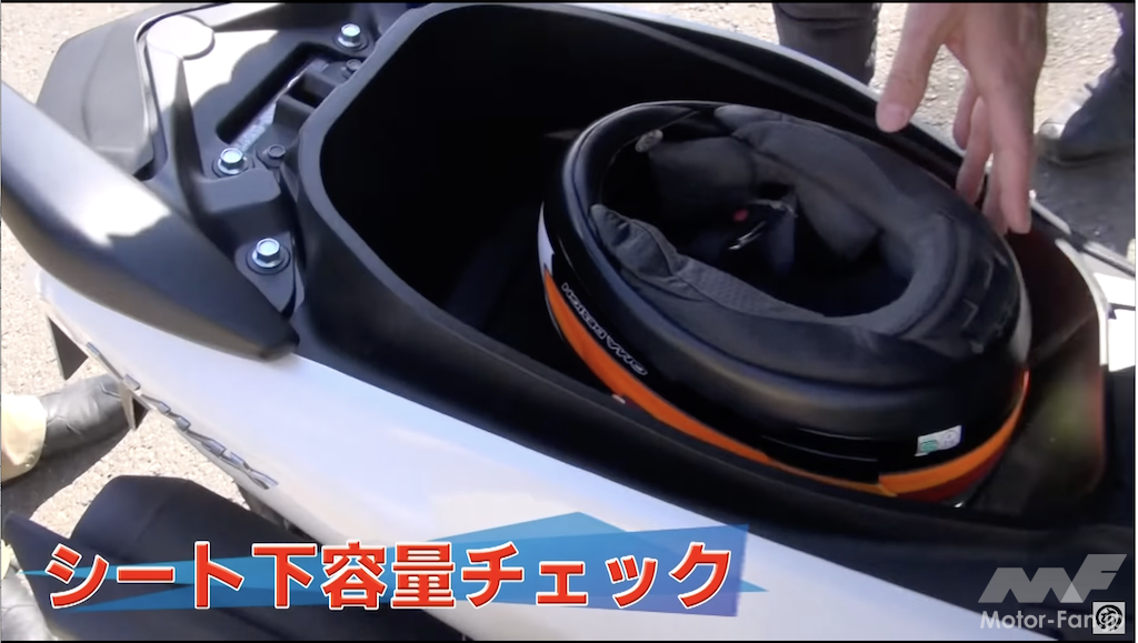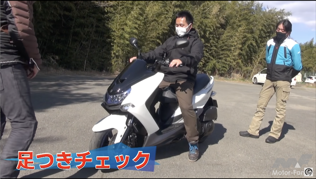 NMAX155でもマジェスティ同様のチェックをしている。順番は前後しているが足つき性は編集部サンタサンが担当して不安のないことを確認しつつ、ステップボードの前が広いことを絶賛。シート下もフルフェイスを逆さにして収納可能であることを確認。デジタルメーターはスポーツモデルなのに燃費計算が可能であることを紹介している。
