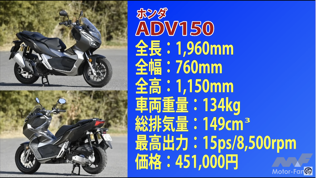 続いてはアドベンチャーモチーフのスタイルで話題を集めるホンダADV150が登場。スクーターでも悪路走破性の高さを備え、カッコだけのモデルではないことが人気の理由。今回比較した4車のなかで最も高価な価格設定になっているが、それだけの価値あるプレミアムなスタイル・走行性能といえるだろう。