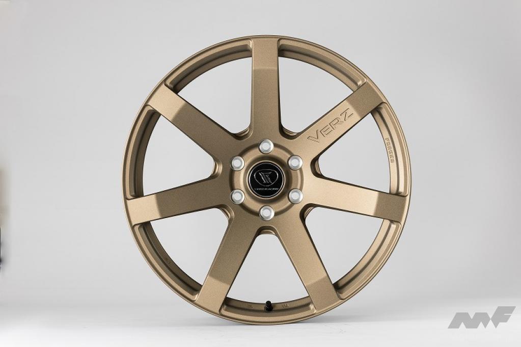 正面から見るとオーソドックスな7本スポークとなります。鍛造ホイールのため、22インチという大口径サイズながらも軽量化と高剛性がセールスポイントです。こちらのカラーは「サンドブロンズ」となります」