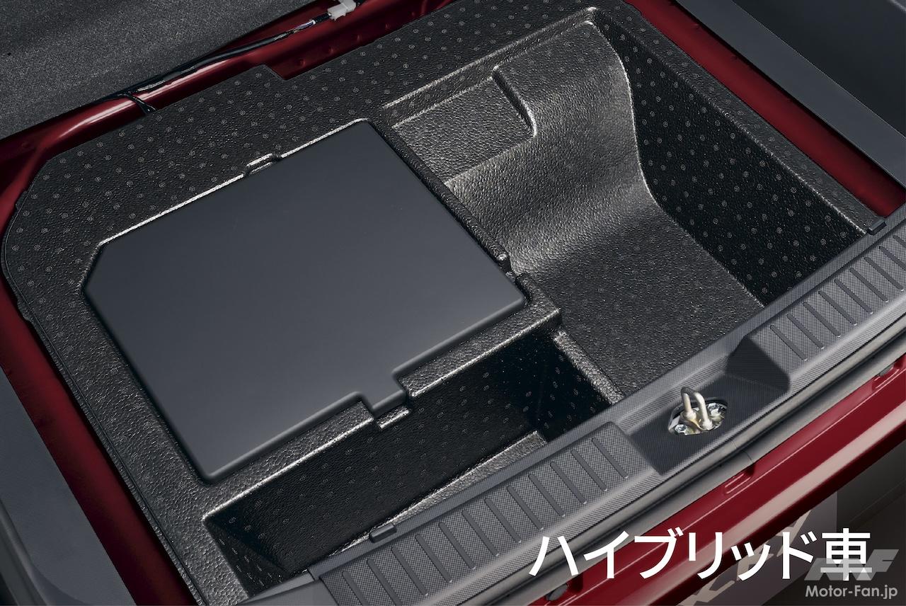 こうなると、後席の広さがラゲッジに影響を及ぼしそうなものだが、荷室も広い。通常時でも奥行きは長く、後席使用時でも369Lを確保し、床下収納(デッキボード下)も驚くほど深く、デッキボード下を含めると449Lに達する。6対4分割可倒式の後席背もたれを前倒しすると、段差は残るものの、広大な積載スペースを確保。2人までのキャンプなら十分にカバーできそうな積載力で、BセグメントSUVを含めてもトップクラスの荷室容量を誇っている。なお、トヨタ・ヤリスクロスの荷室容量は371L、マツダCX-3は350L、マツダCX-30は430L、日産キックスは423Lなどとなっていて、売れ筋のBセグSUVよりも広い。