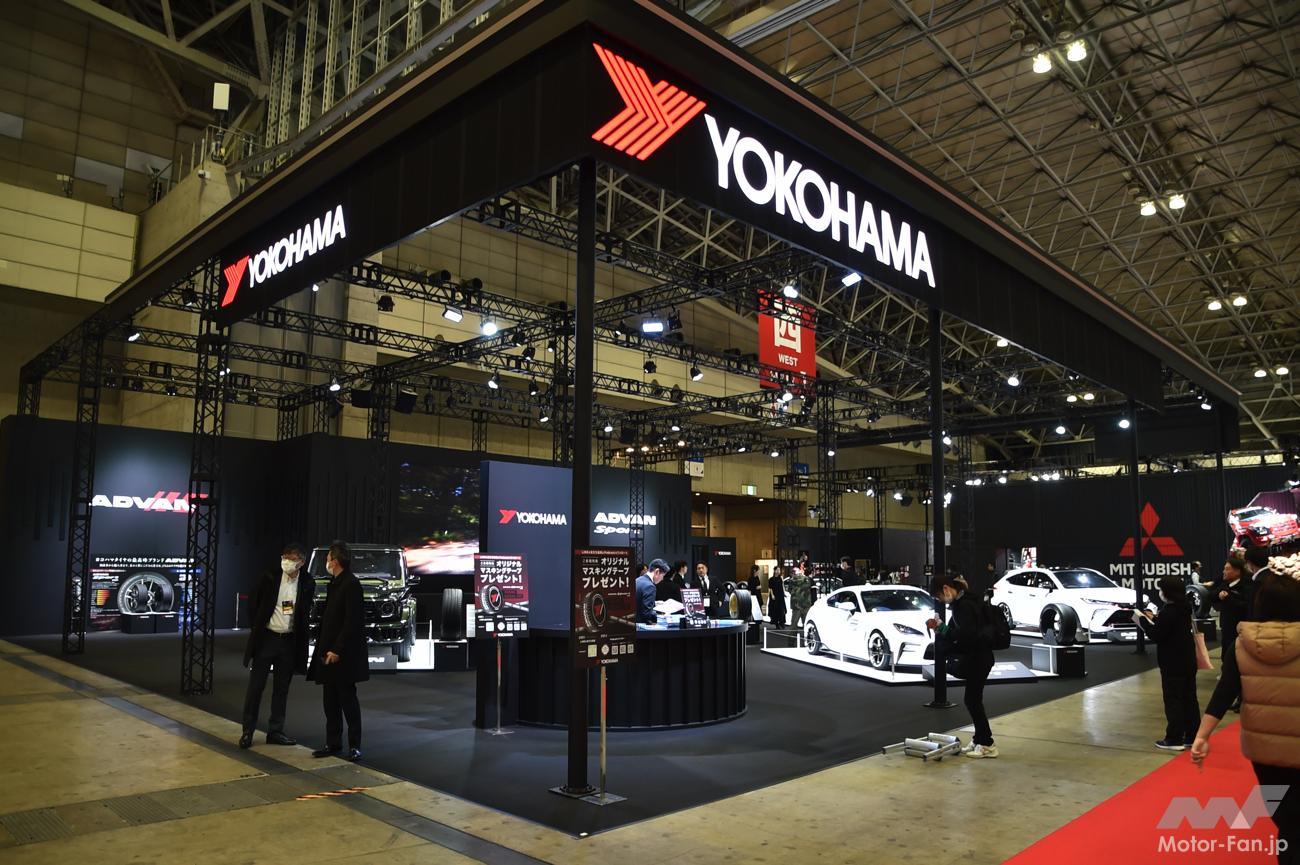 幕張メッセ・西ホール1の横浜ゴムブースは黒をベースに横浜の赤と黒のロゴをあしらったシックなしつらえ。虚飾を廃し横浜ゴムと「ADVAN」および「ADVAN Sport」ブランドをアピールしていた。