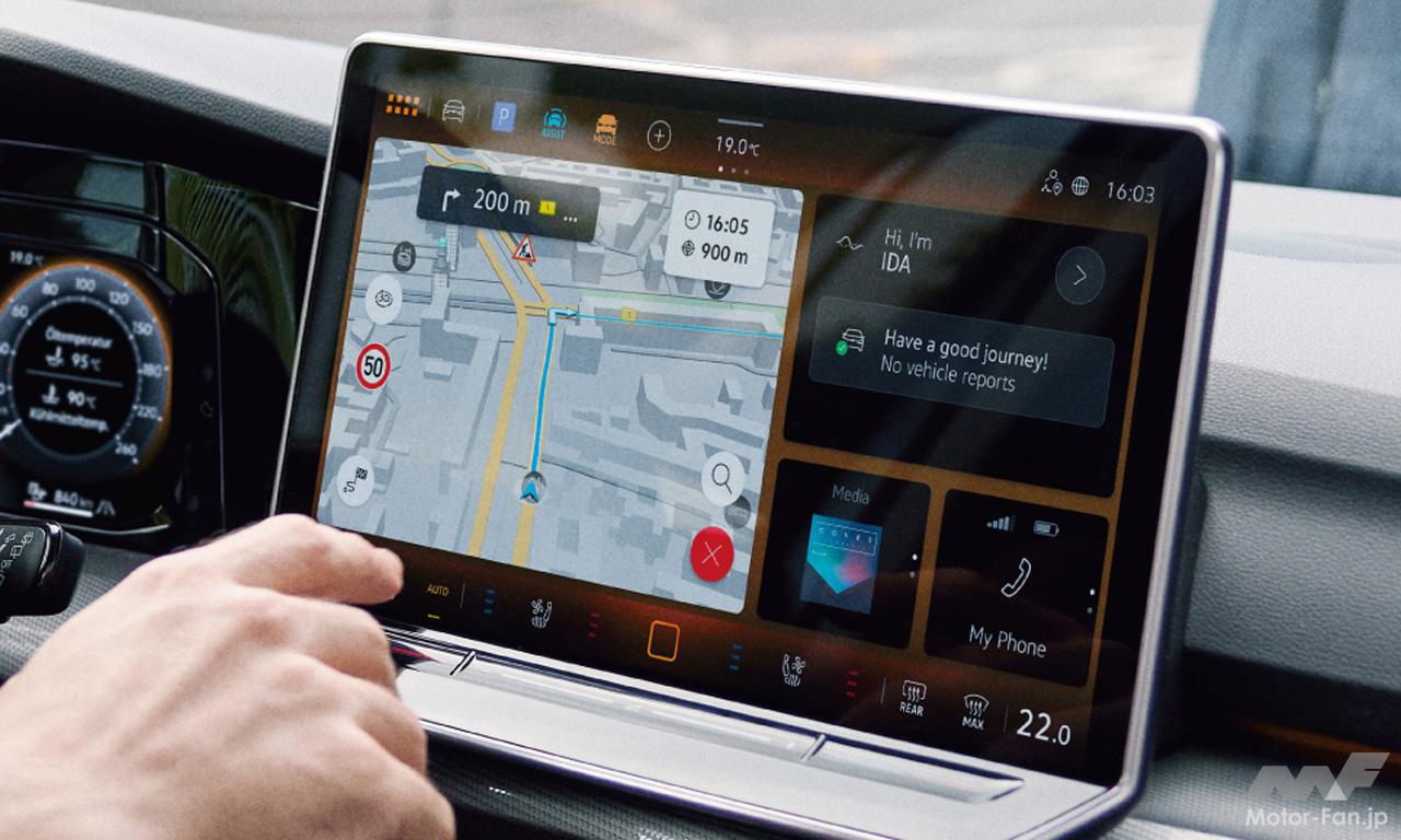 新インフォテイメントシステム“MIB4”は、12.9インチの大型タッチディスプレイを採用。ディスプレイ下部にはバックライト付きタッチスライダーバーを設置し、夜間でのエアコン温度設定や音量設定の操作性を改善。さらにシステム演算処理性能の向上により、地図スクロールなどのレスポンスも向上している。“MIB4”には音声による機能操作“IDA(アイダ)ボイスアシスタント”が搭載されており、インフォテイメントやエアコンなど多くの機能を、音声でコントロールできる。