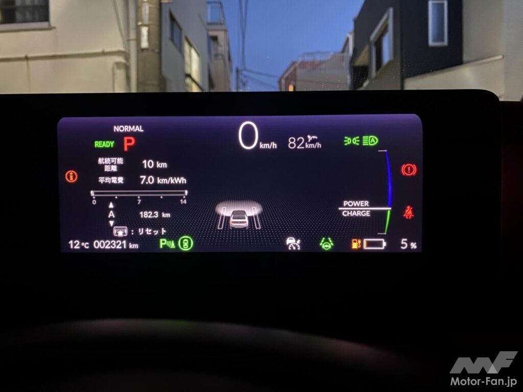 Honda eで自宅にたどり着いた時のバッテリー残量は「5%」航続可能距離は10kmとなっていた。182.3km走ったあとの数字だから、航続可能距離は192.3kmということになる。