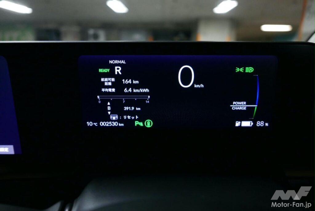 これは1kWhのバッテリーで何km走れるか、という意味だ。Honda eの電費計の数字が7.3km/kWhとどのくらい離れているか、を見ながらドライブしてみよう。
