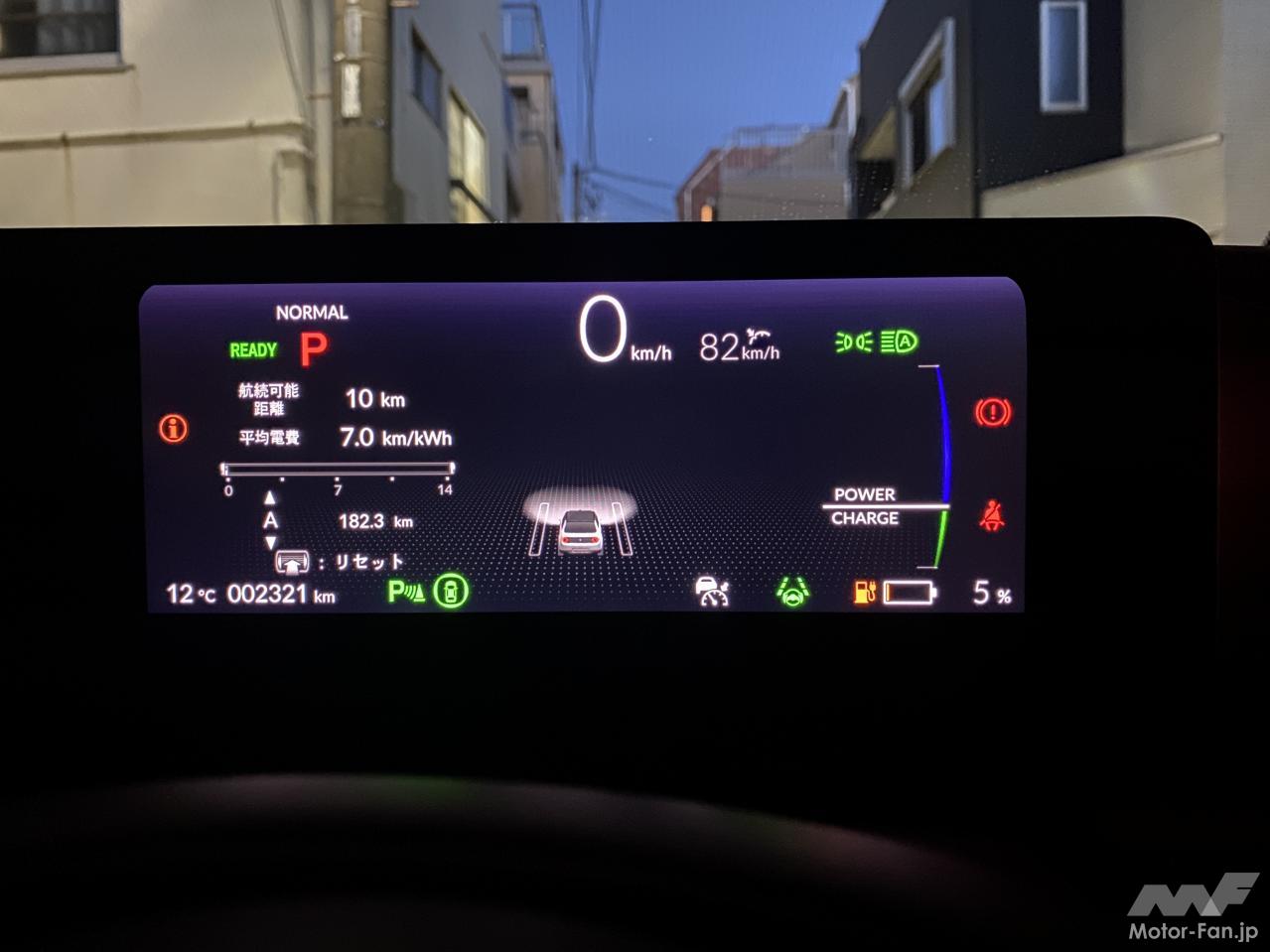 Honda eで自宅にたどり着いた時のバッテリー残量は「5%」航続可能距離は10kmとなっていた。182.3km走ったあとの数字だから、航続可能距離は192.3kmということになる。