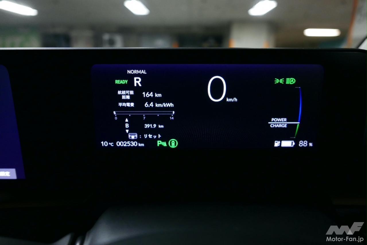これは1kWhのバッテリーで何km走れるか、という意味だ。Honda eの電費計の数字が7.3km/kWhとどのくらい離れているか、を見ながらドライブしてみよう。
