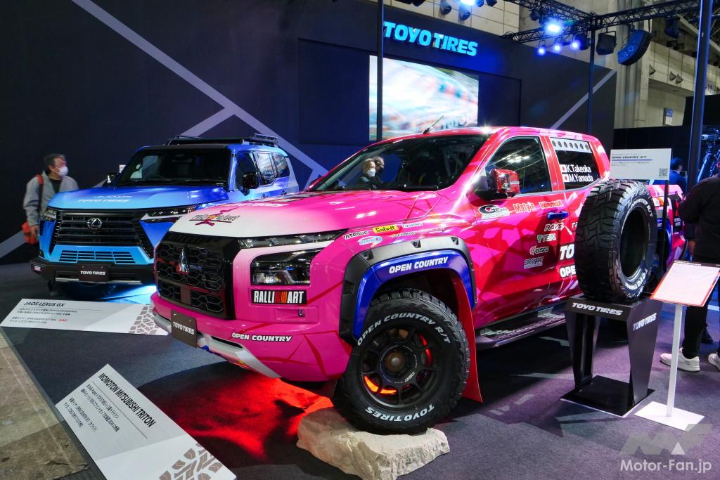 その迫力マシンの奥にあるのがピンクの可愛らしい三菱トライトン。これは、モータージャーナリストも務める竹岡圭さんがラリー参戦するマシン。OPEN COUNTRY R/Tが装着される。