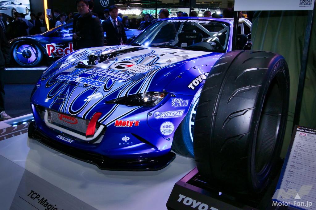 その奥にはNDロードスターが展示される。マイクの息子リンカーンの愛車だ。こちらもドリフトパフォーマンス用に開発され、足元はPROXES R888Rを装着。なにより驚くのはエンジンにNA6ローターエンジンを搭載していること。その出力は800psという。我々の常識を覆すマシンとなっていたのだ。
