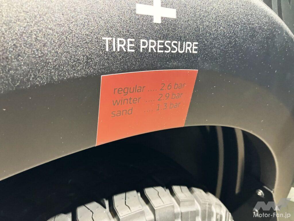 ホイールを覆うフェンダーガーニッシュに貼られたデカールには『レギュラー 2.6bar/ウインター2.9bar/サンド1.3bar』と状況に合わせたタイヤエア圧の指定値が書かれています。オレンジのベース色もさし色として効いているものですし、こうした実用性のあるデータを記しておくことでタフなSUVテイストが強まるアイデアではないでしょうか。