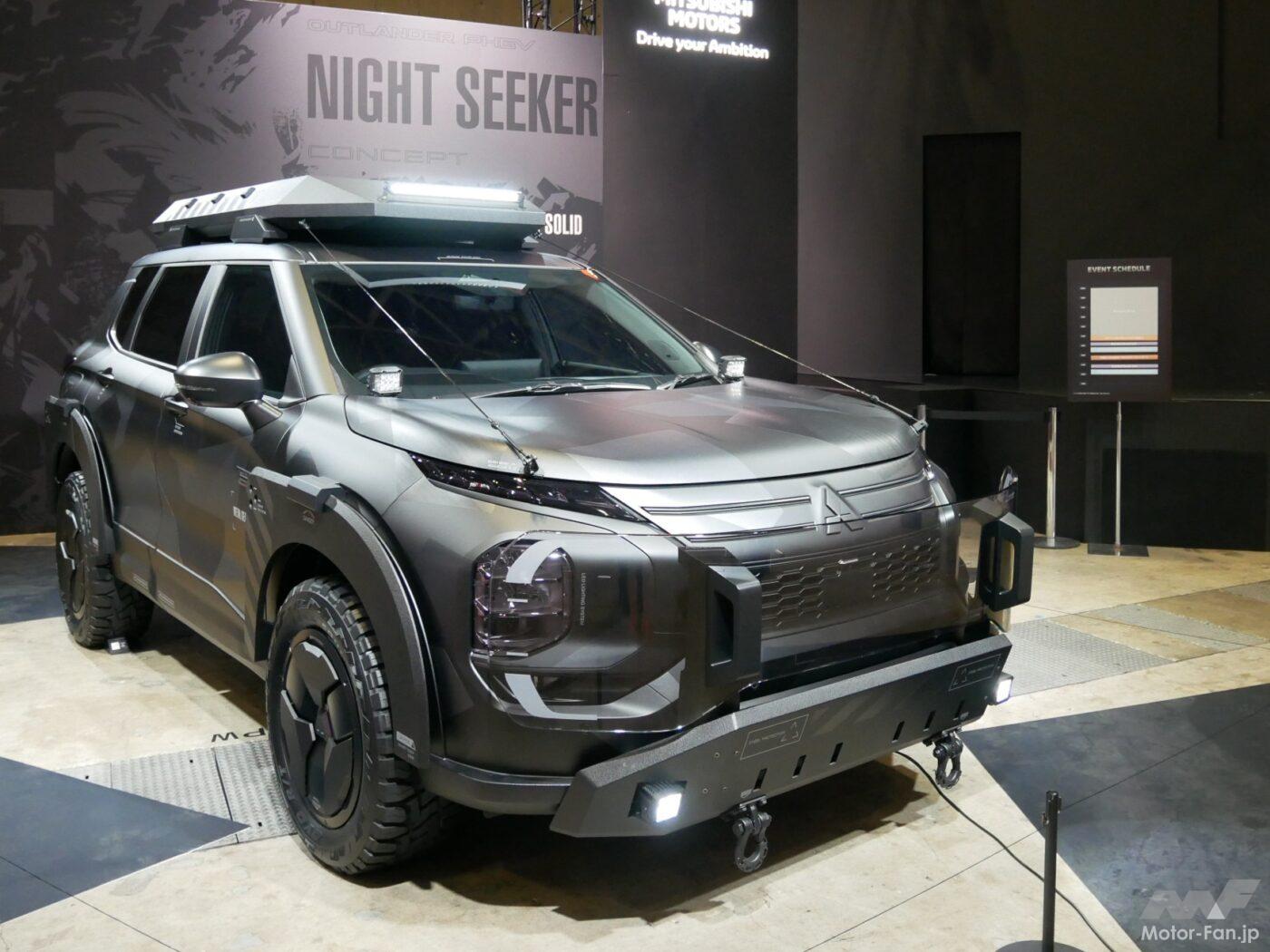 2024年のマイナーチェンジにより駆動用バッテリーをサイズアップ、電動化テイストを強めたアウトランダーPHEVは、MGS(メタルギアソリッド)とコラボレーションしたカスタマイズ仕様「NIGHT SEEKER CONCEPT」に仕上げられています。